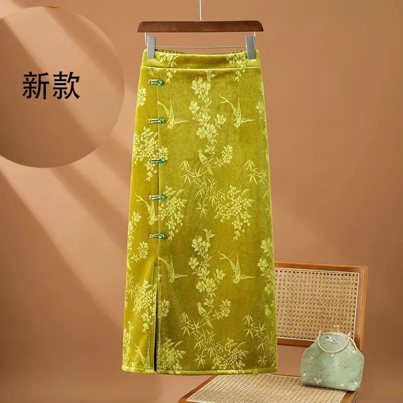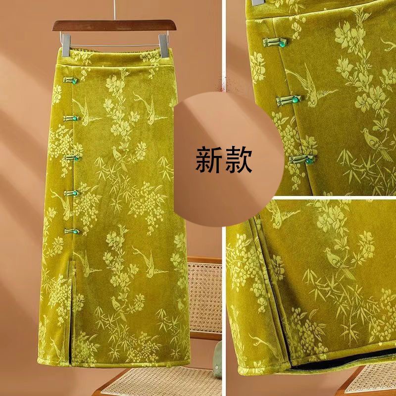 新しい中国式のスカートの国風の復古の盤はジャカードの半身のスカートの女性の秋の金のベルベットのオープンフォークのお尻の膝の長いスカートを掛けます。
