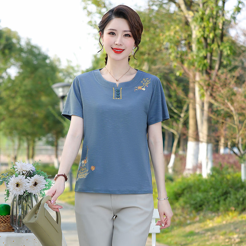 お母さんの夏服の新型半袖tシャツ40-50歳の中高年の婦人服のゆったりしている大きいサイズの肉を遮る上着の通気性の小さいシャツ