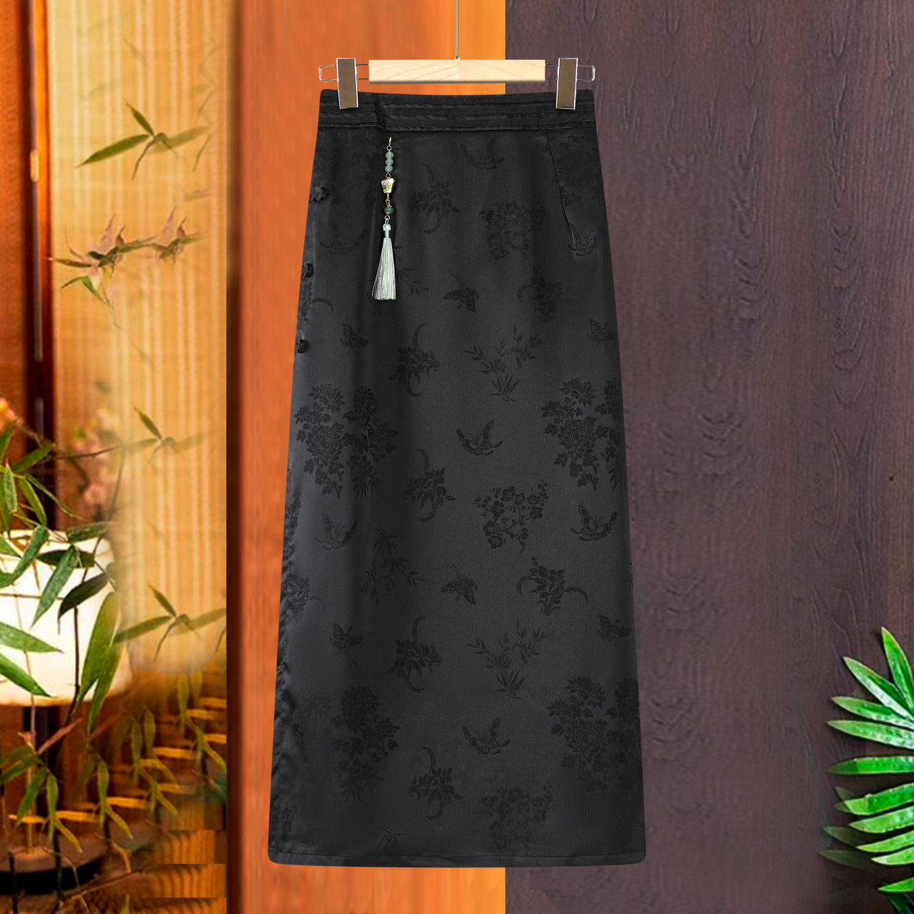 国風レトロジャカード酢酸サテンスカート女性新中国式オープンフォークヒップスカート