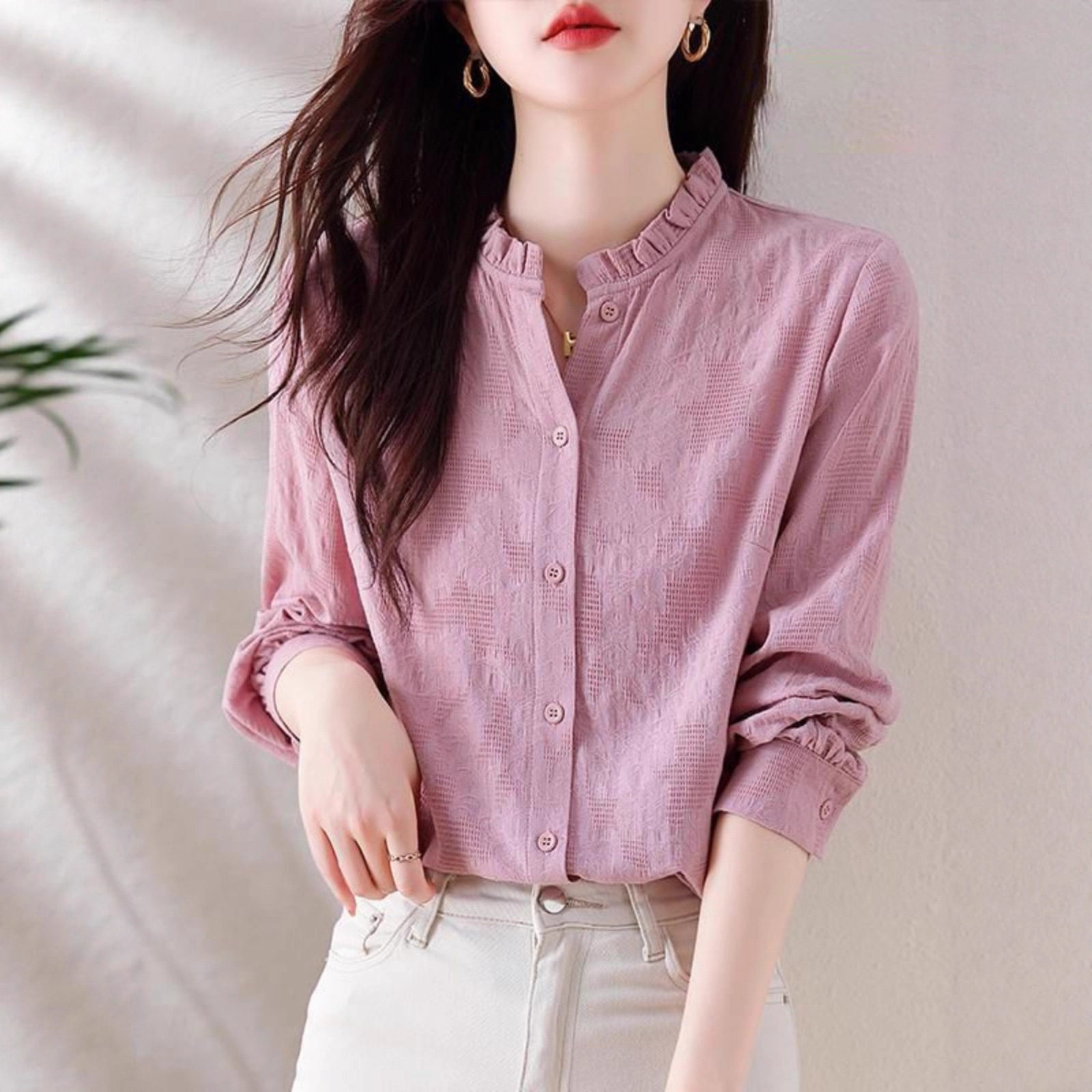 2025年新作、裏起毛・厚手、襟付き、フリル付き長袖シャツ、エレガントで若々しい、おしゃれなレディースシャツ