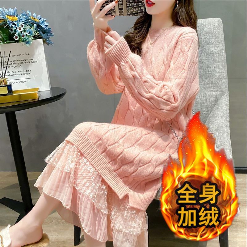 女性の毛のスカートの中の長いタイプのレースの秋冬は長袖のニットのワンピースを厚くします。