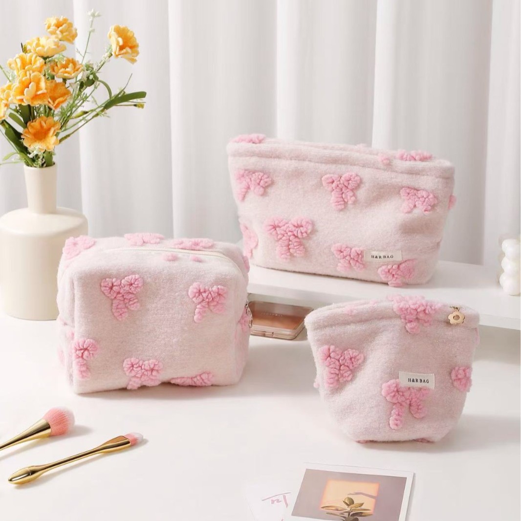 新しい甘いガーリーピンクぬいぐるみリボン化粧品バッグポータブルスキンケア製品収納袋クラッチバッグ