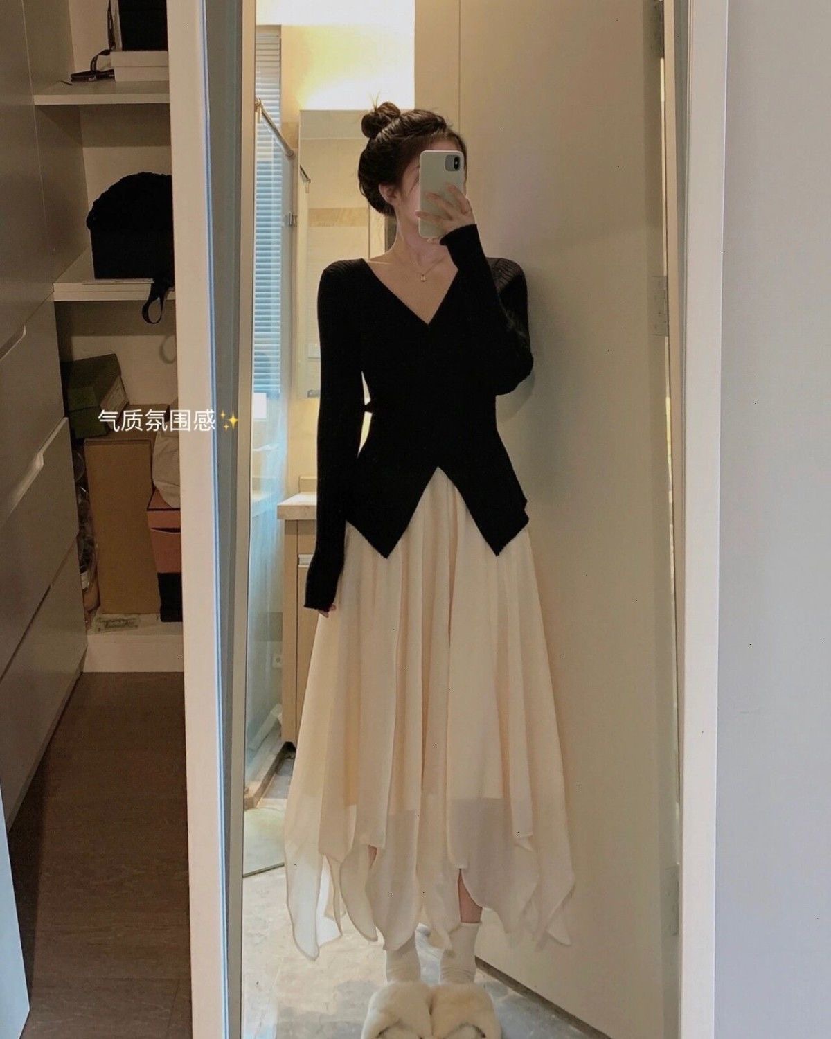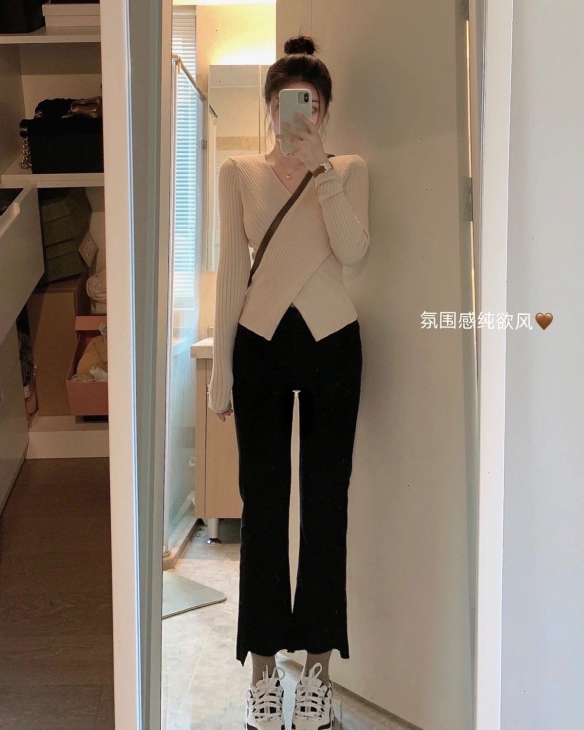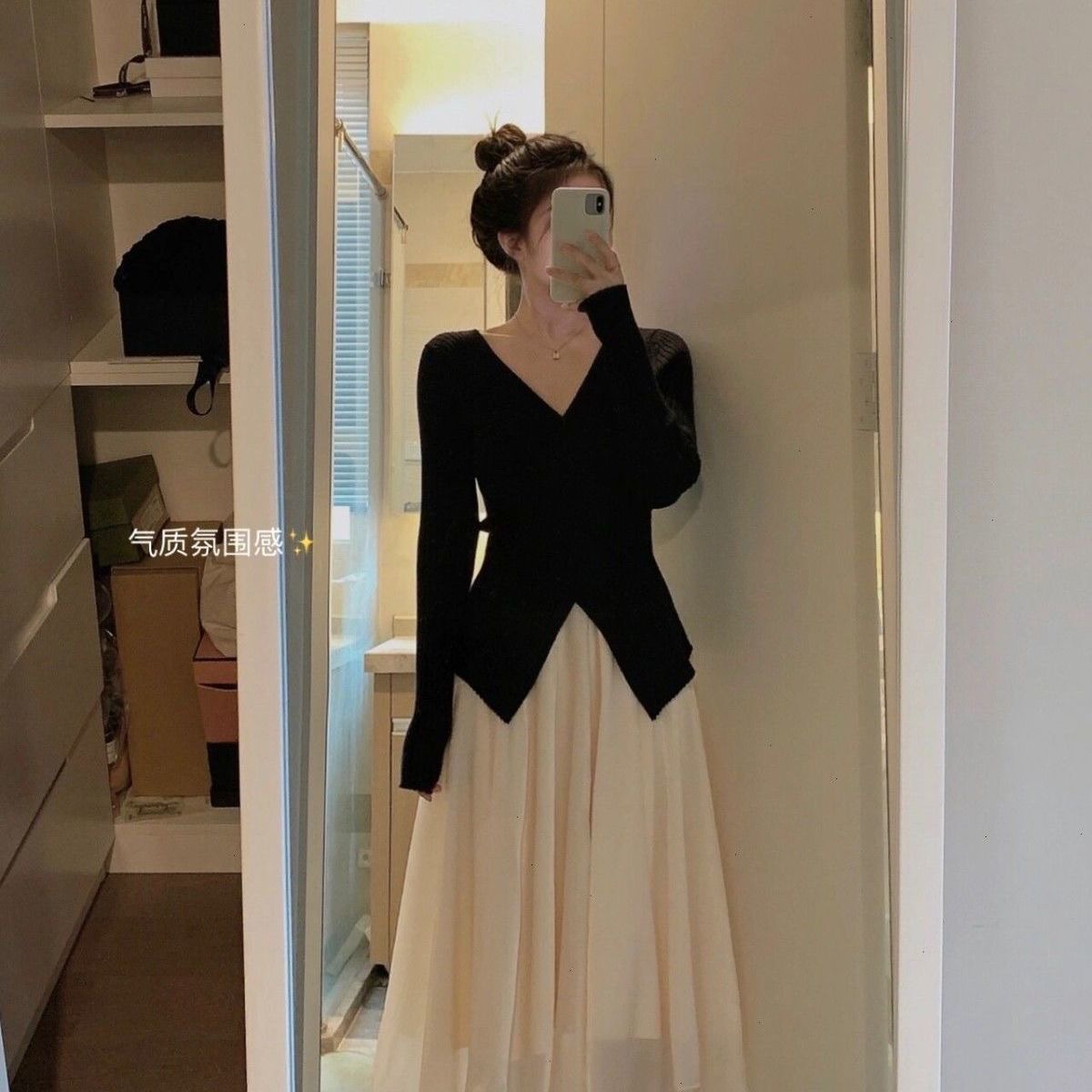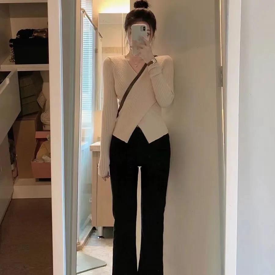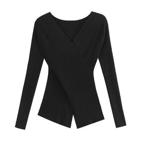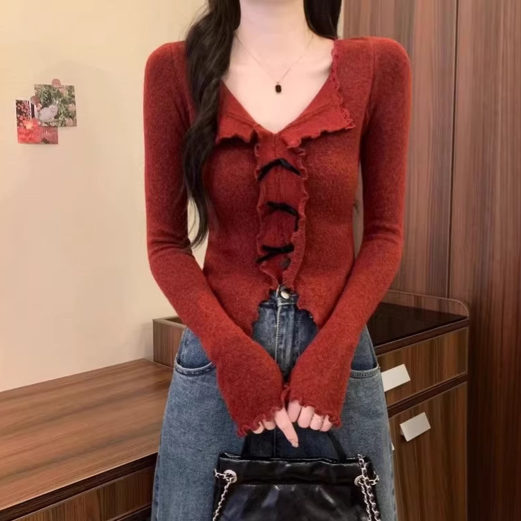 木耳边蝴蝶结v领针织衫女春秋小众收腰开叉内搭打底衫百搭上衣