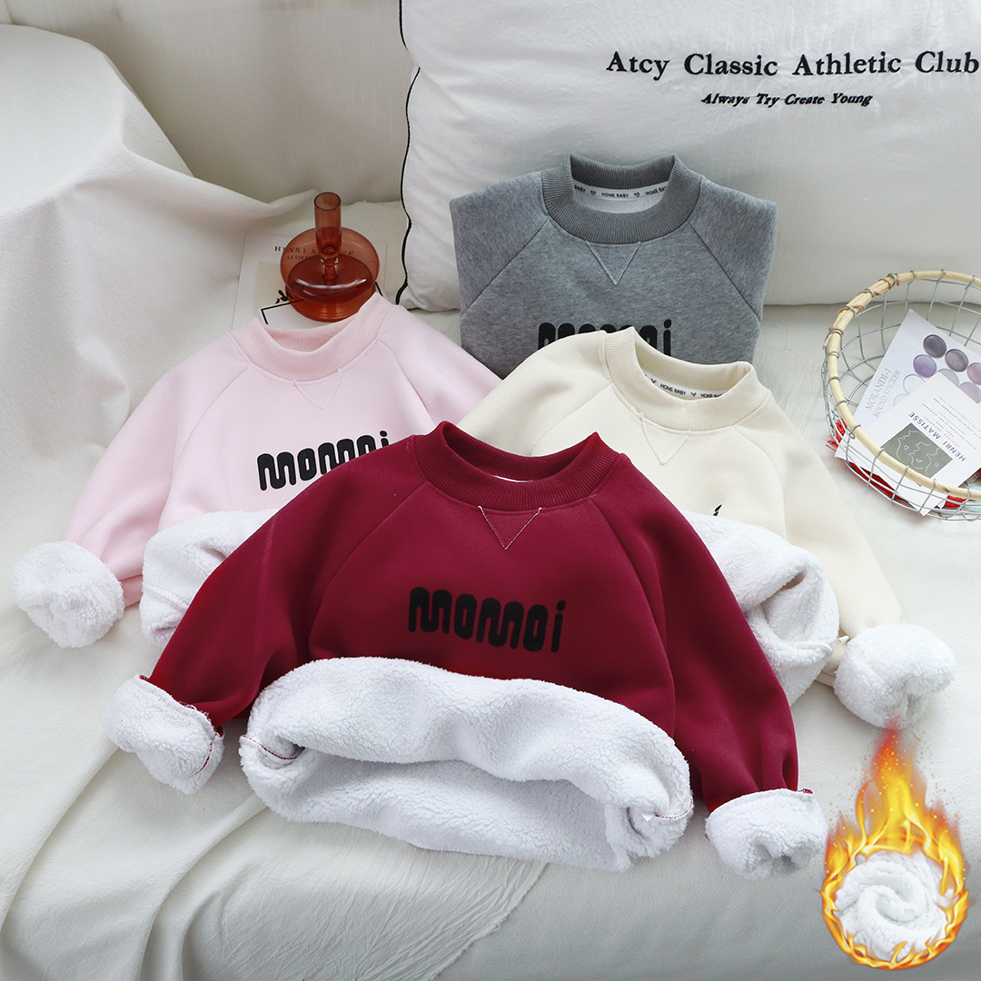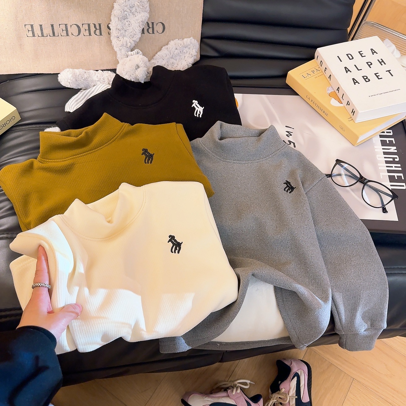 男の子と女の子用の子供用ベルベットトップス、ハーフタートルネック刺繍スウェットシャツ、ベルベットと厚みのある秋冬の多用途で柔らかい韓国風長袖