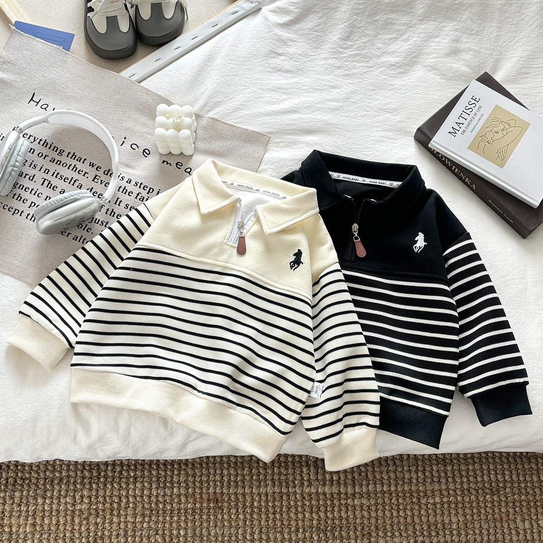 儿童卫衣2025秋季新款男女宝同款拉链polo领长袖条纹拼接百搭上衣