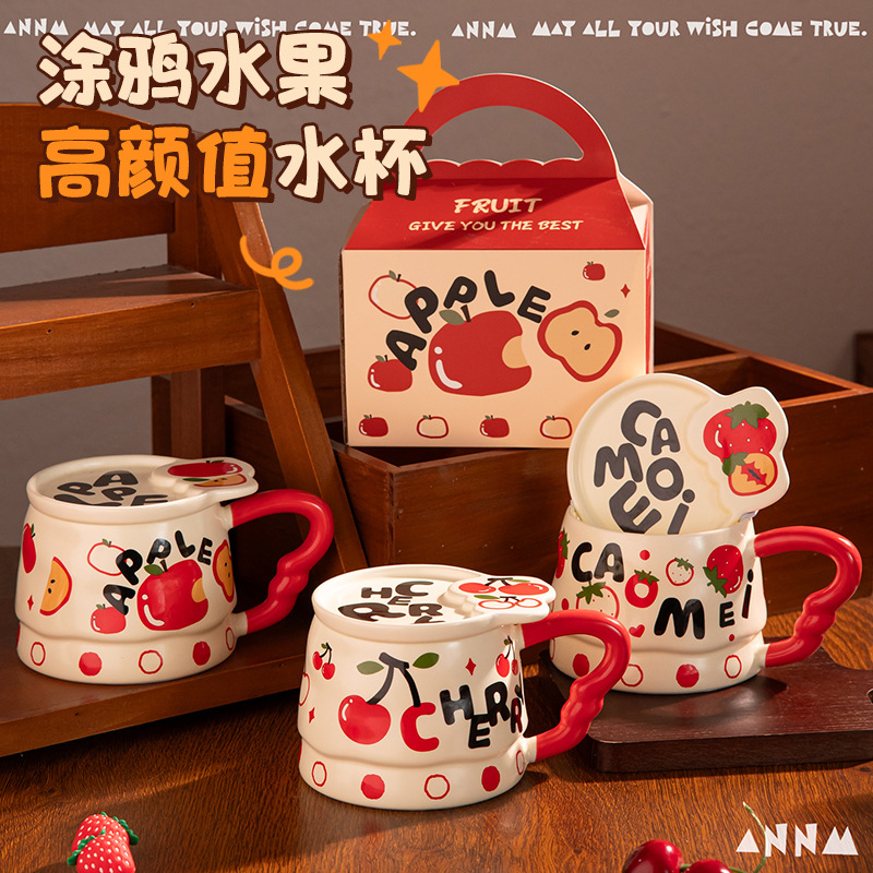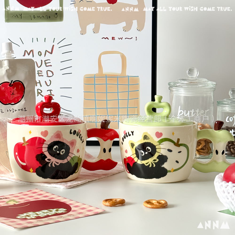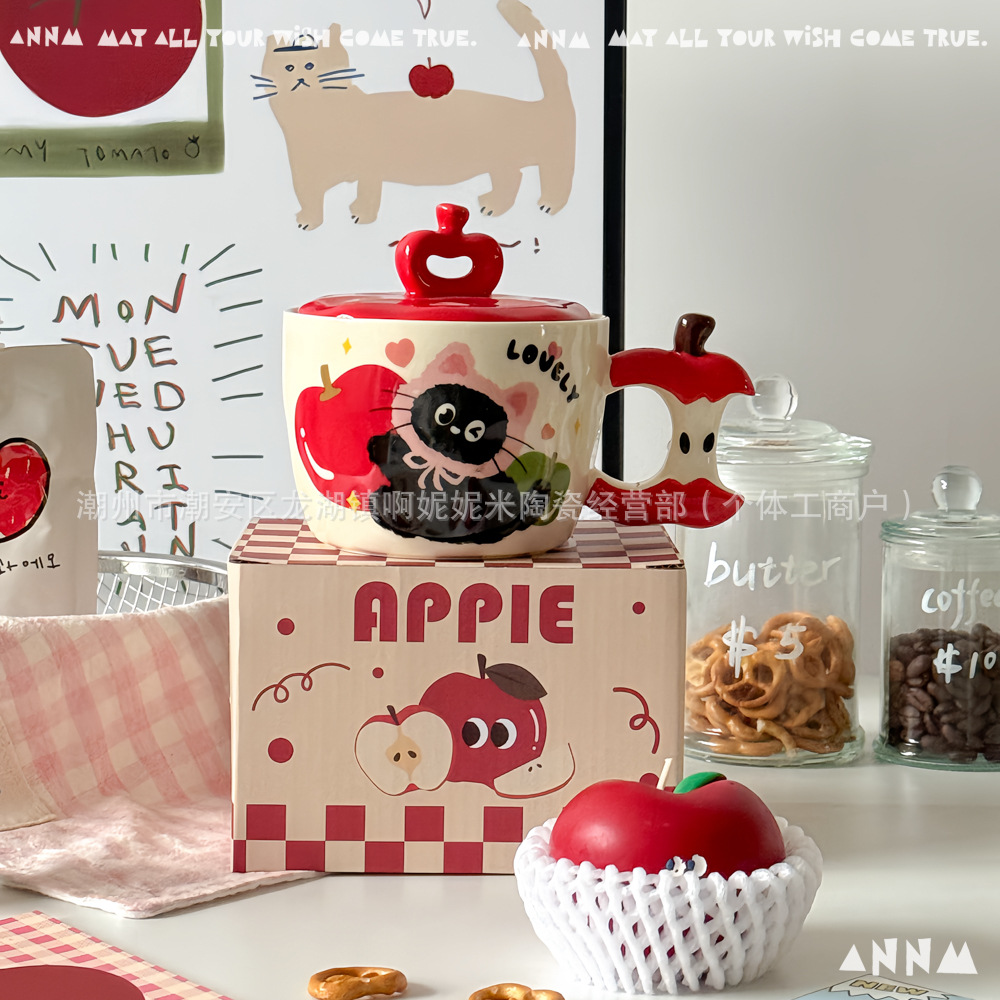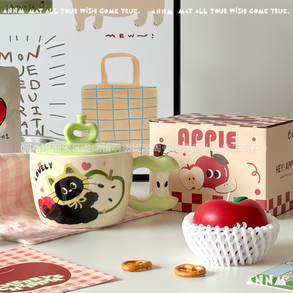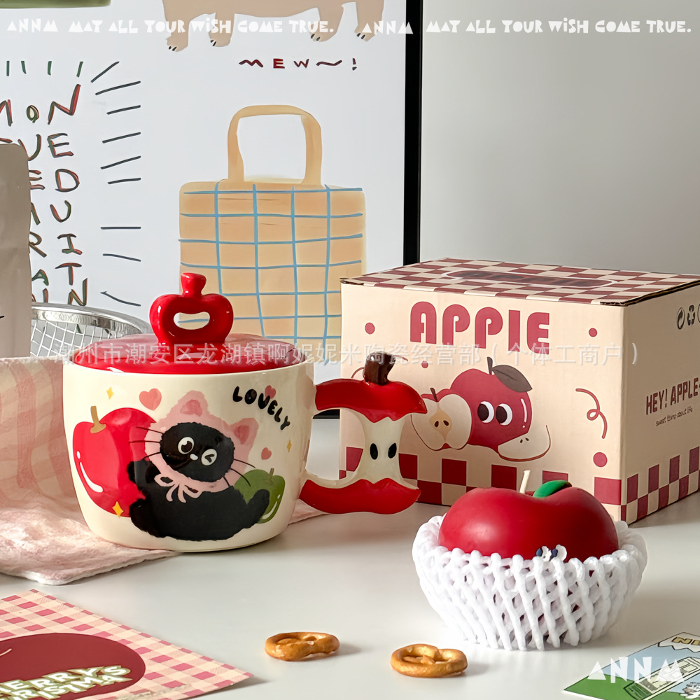 誕生日プレゼントリンゴ猫マグカップ蓋付き陶磁器カップ朝食家庭用かわいいクリエイティブカップクリスマス