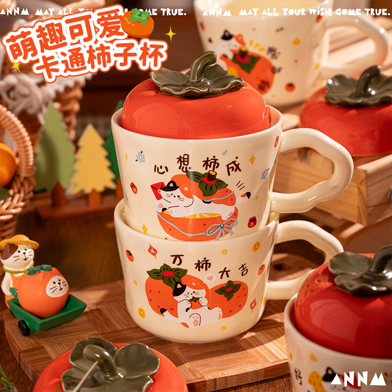 柿柿如意水杯女新款高颜值陶瓷马克杯带盖杯子家用喝水新年礼物