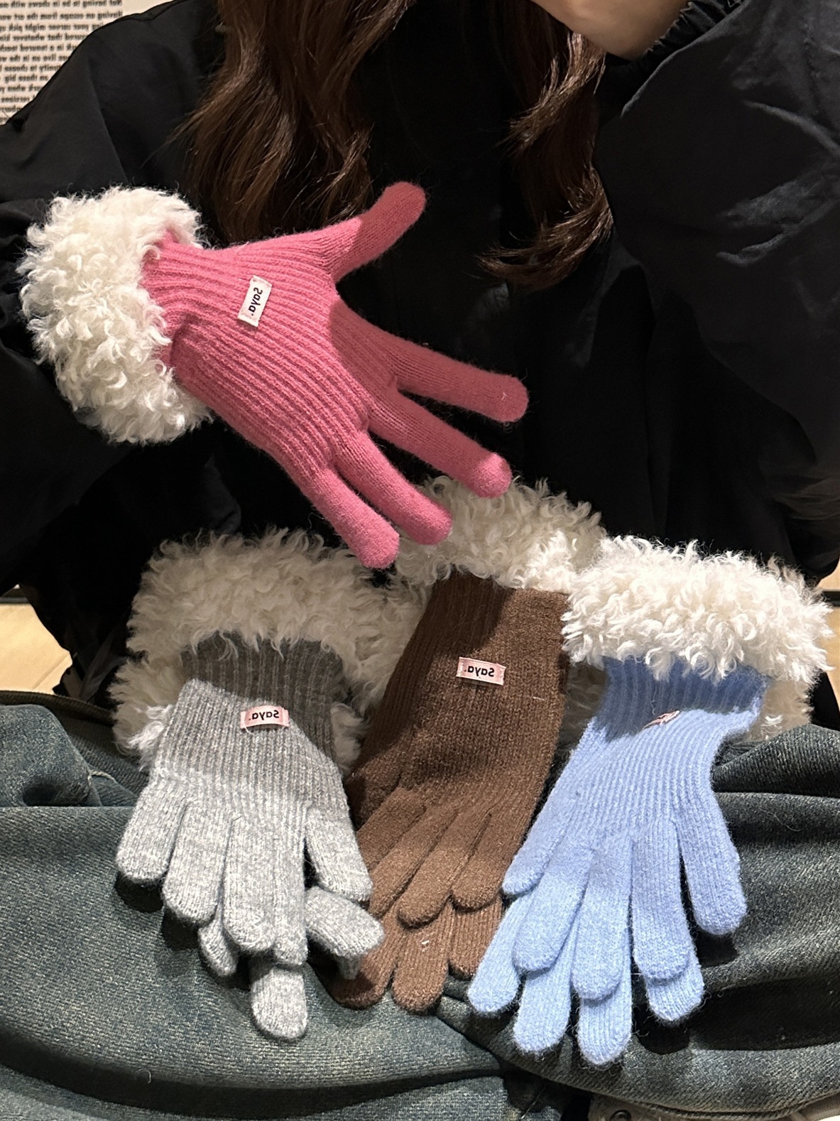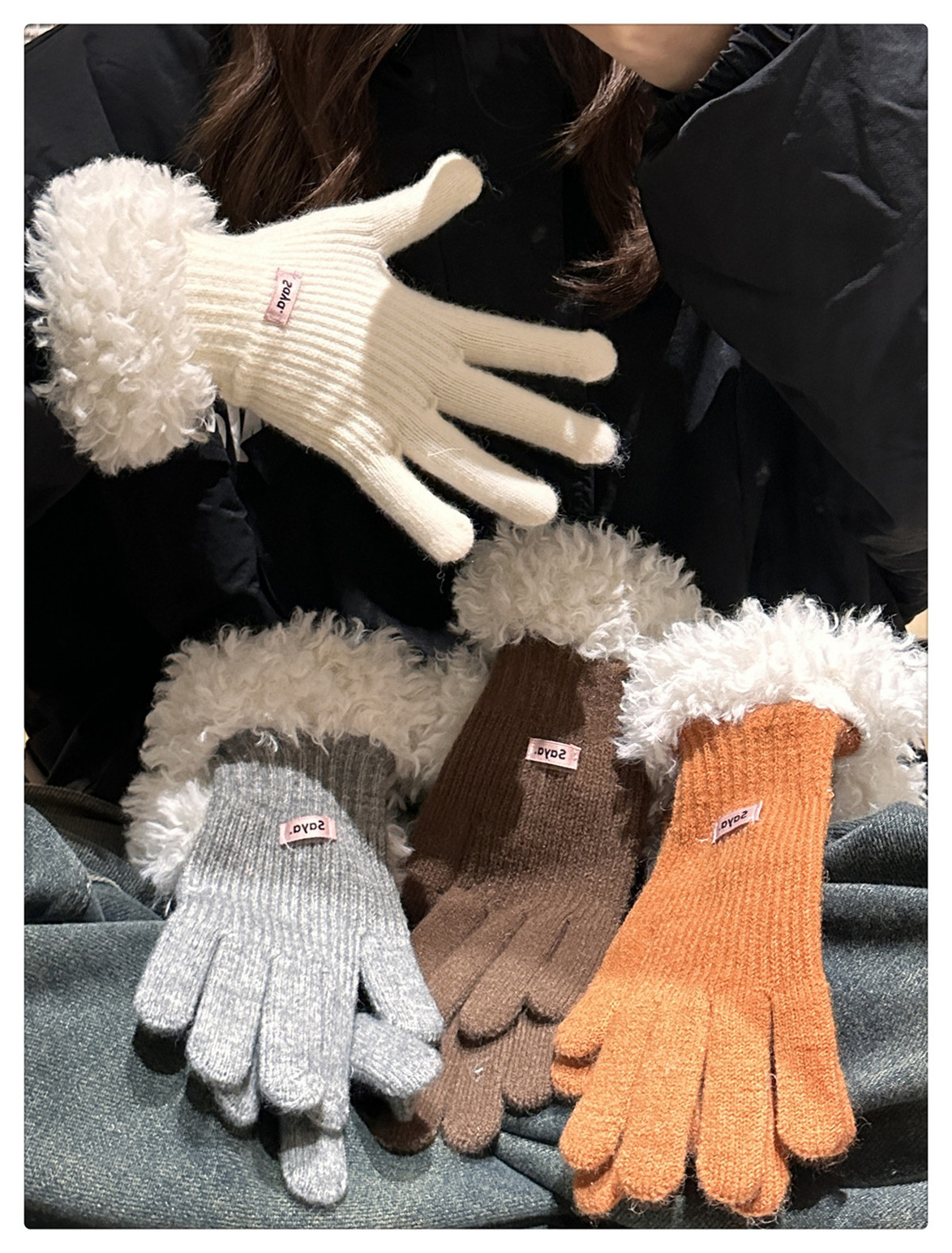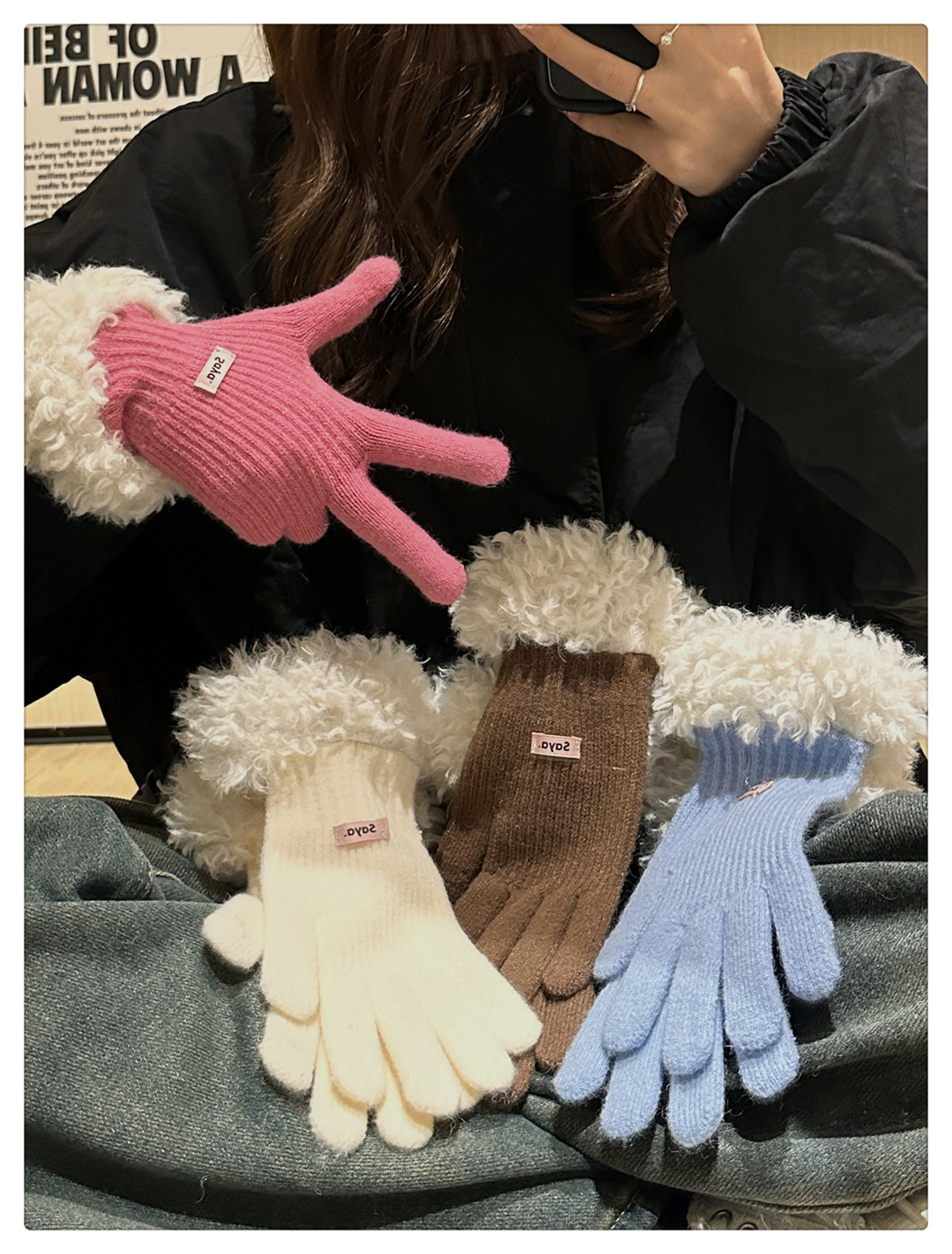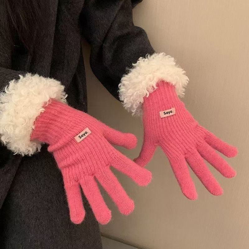 毛の縁の手袋の女性の冬の2023新型の韓国版は厚い保温の毛糸のメリヤスの指の手袋を厚くしてタッチパネルの潮に触れることができます。