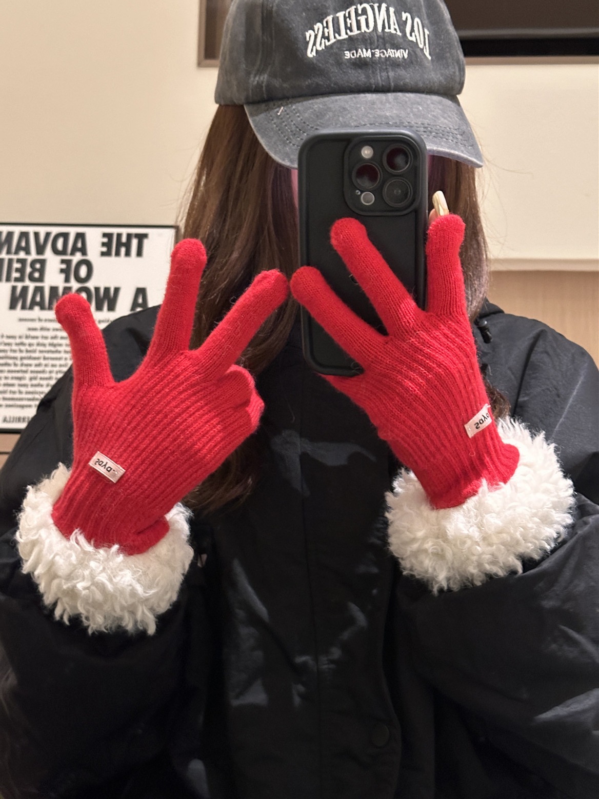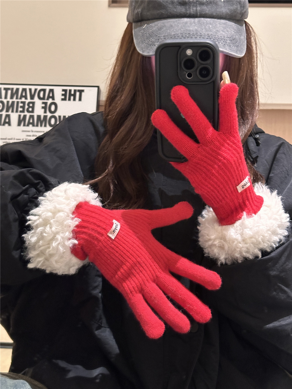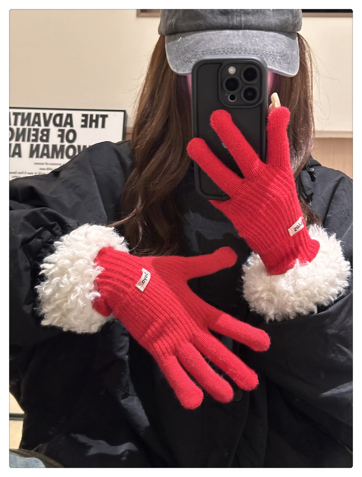 红色兔毛针织毛线手套女2024年秋冬季可触屏加厚保暖防寒五指骑行