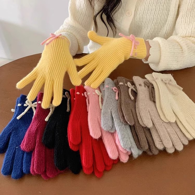 新型韓国版 ~ ピンクの自転車手袋女性冬五本指ニット蝶結び防風保温手袋ins