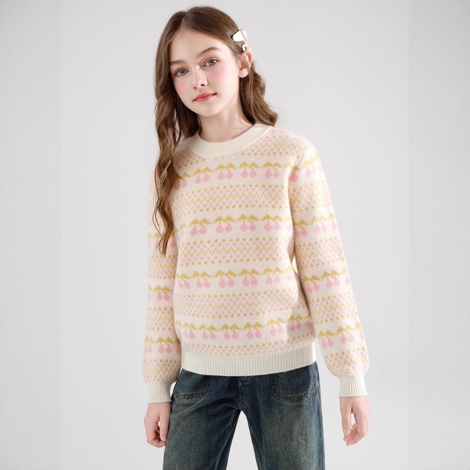 女童100%纯羊毛衫儿童圆领提花针织打底衫加厚软糯亲肤百搭毛衣女