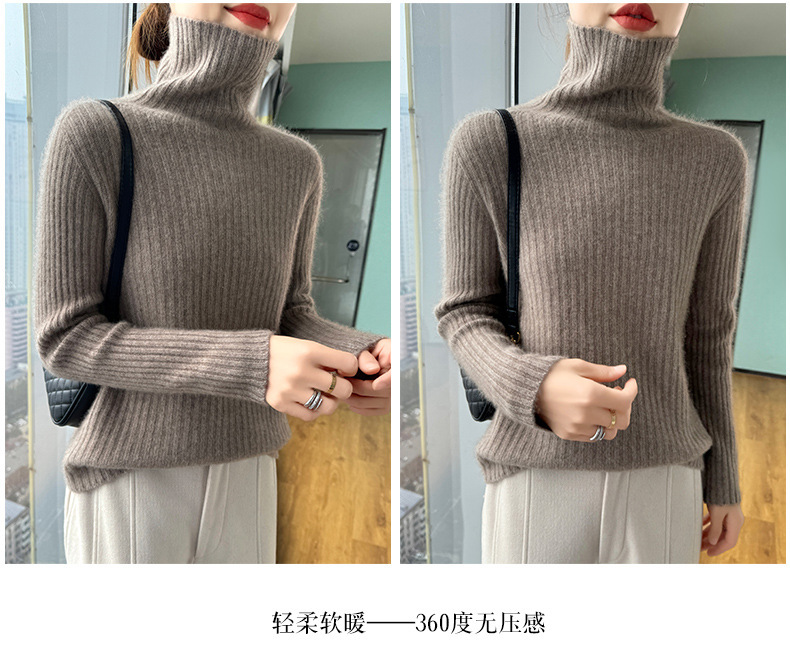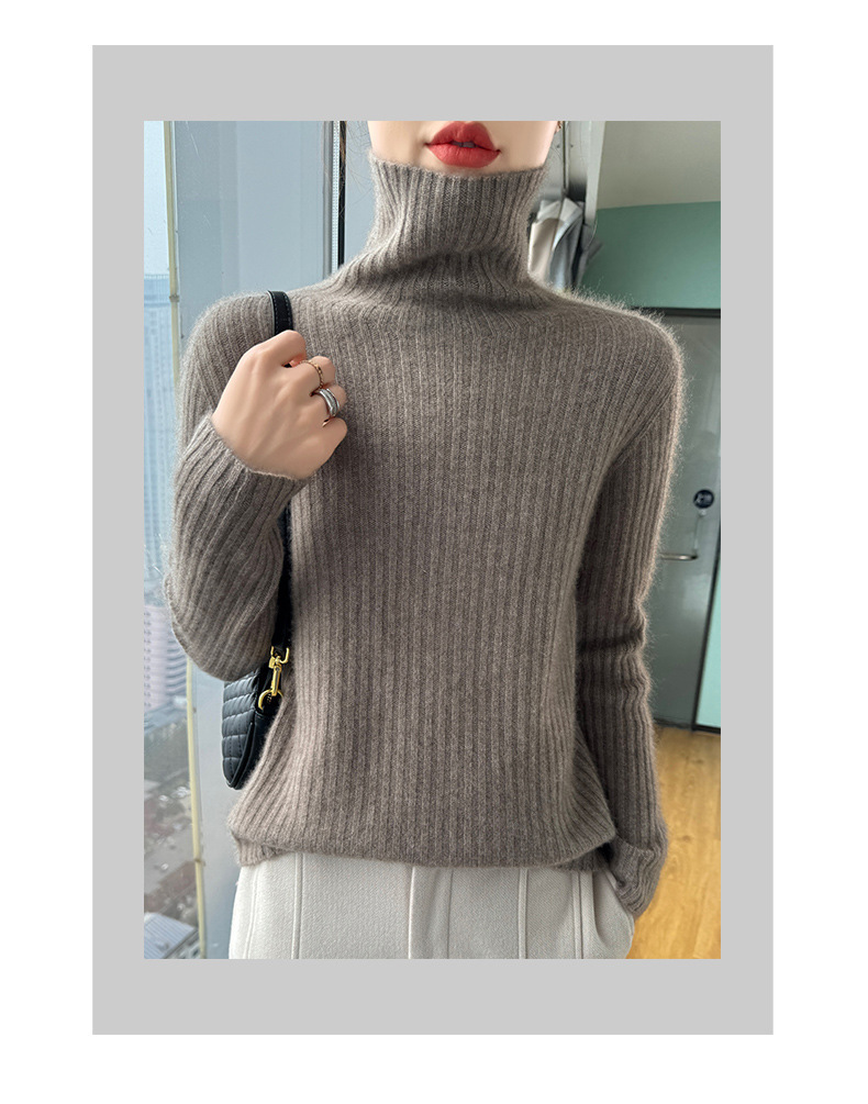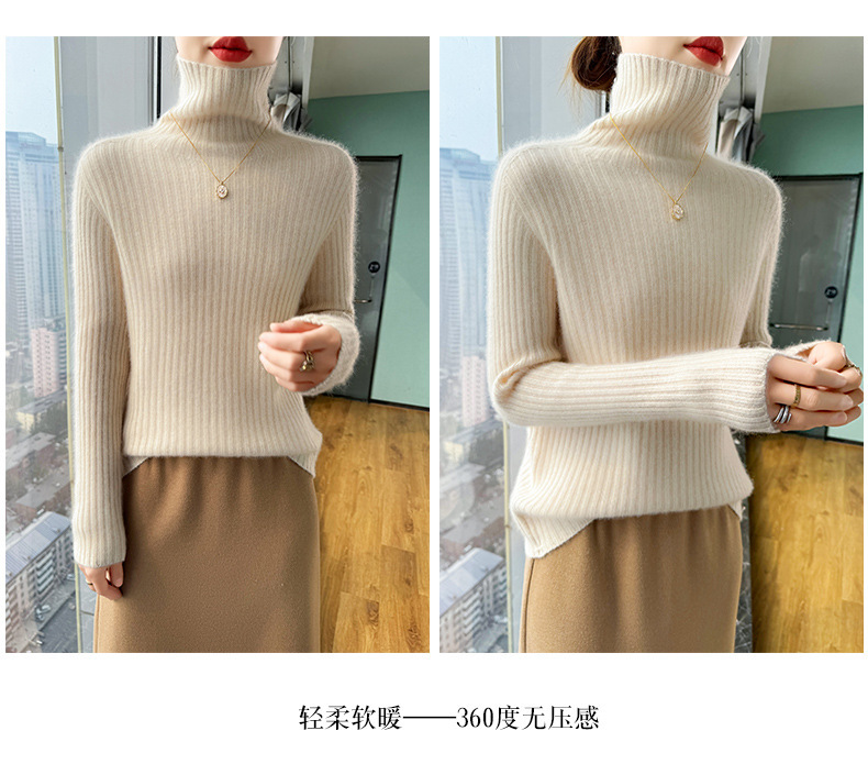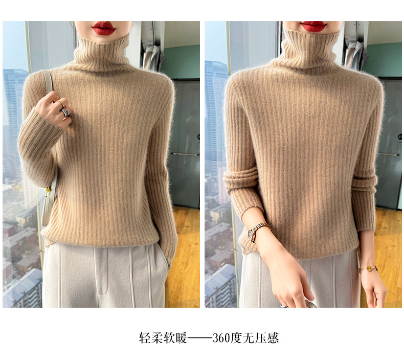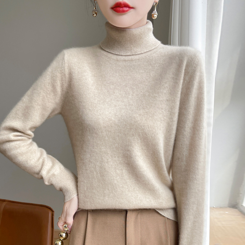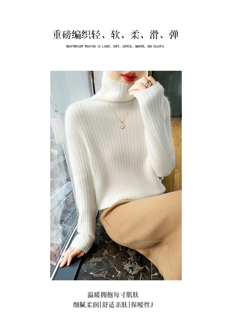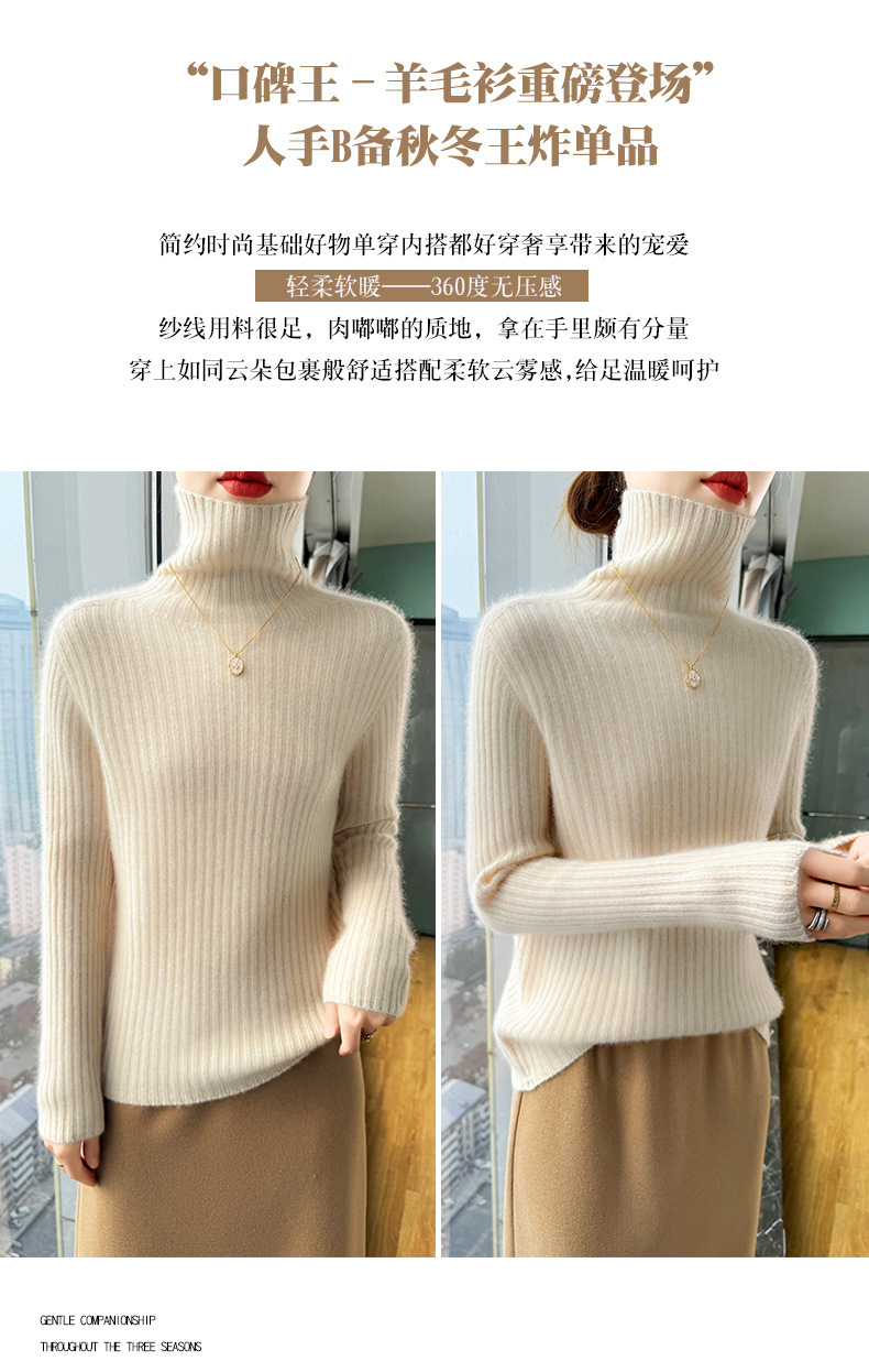 2025年秋冬向けレディースハイネックセーター、ウール100%、ゆったりとしたカジュアルスタイル、袖にスリット入り、ニットカシミヤ素材の厚手インナーセーター