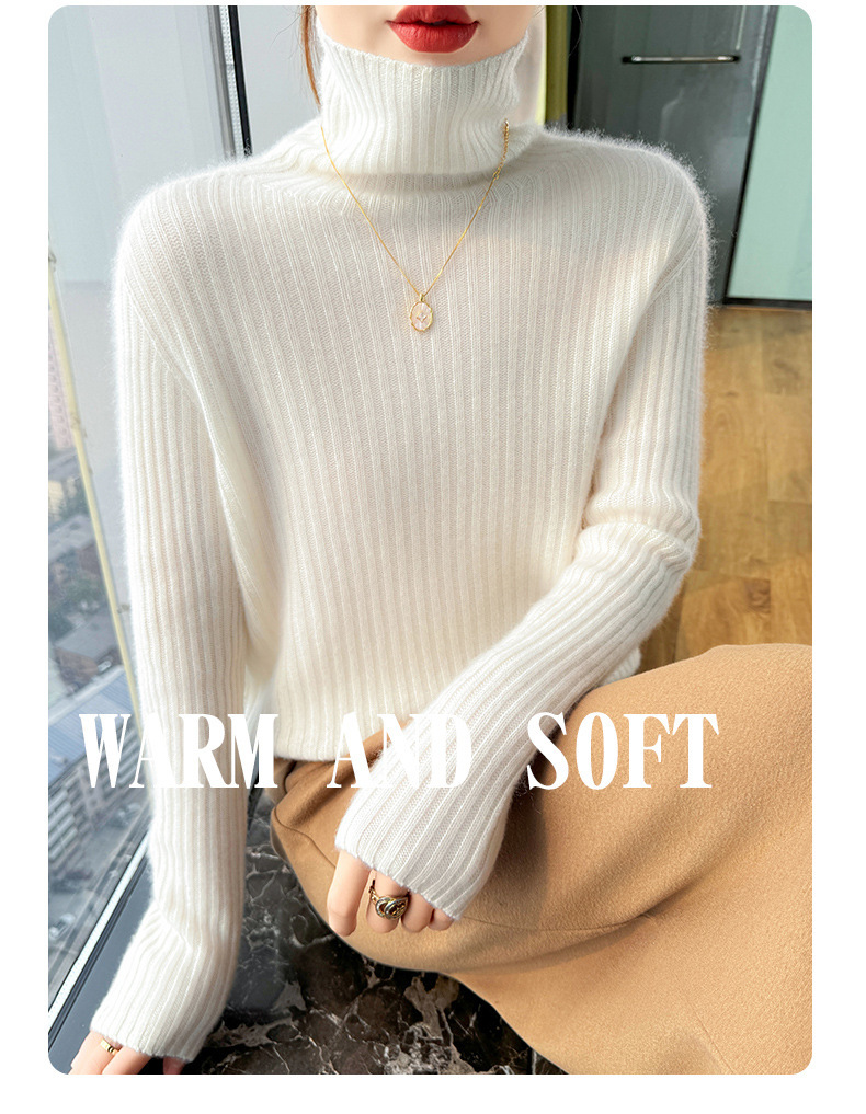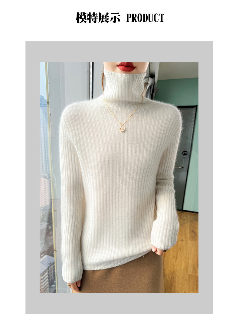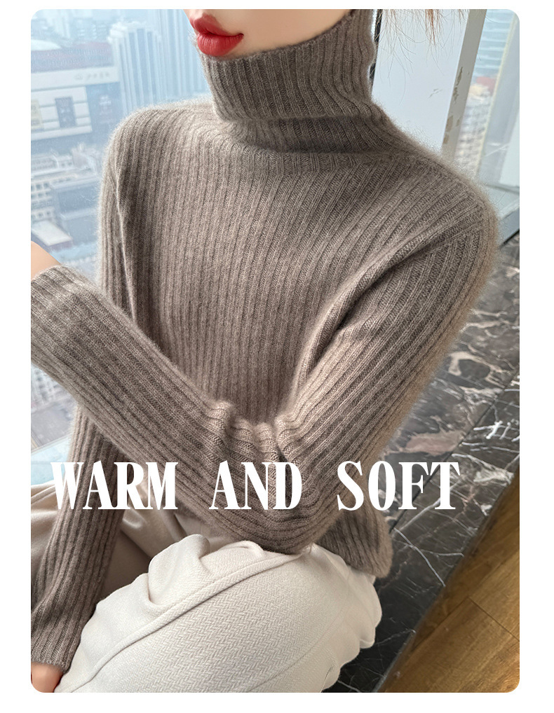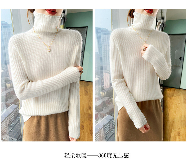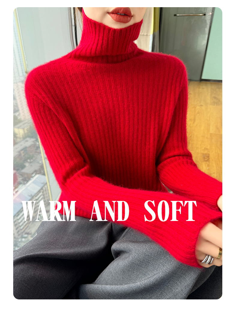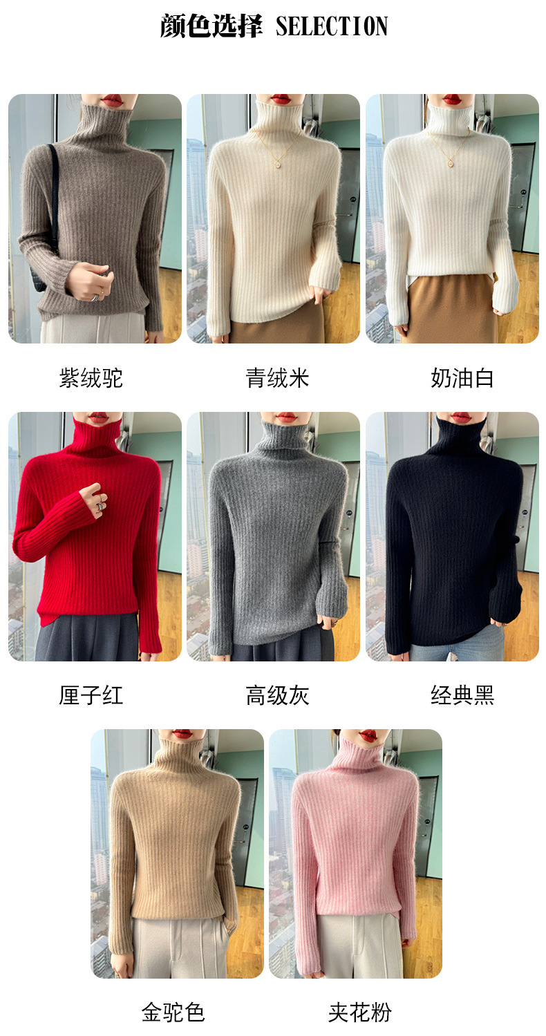 2025年秋冬向けレディースハイネックセーター、ウール100%、ゆったりとしたカジュアルスタイル、袖にスリット入り、ニットカシミヤ素材の厚手インナーセーター