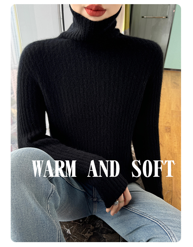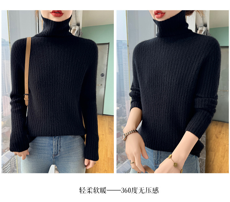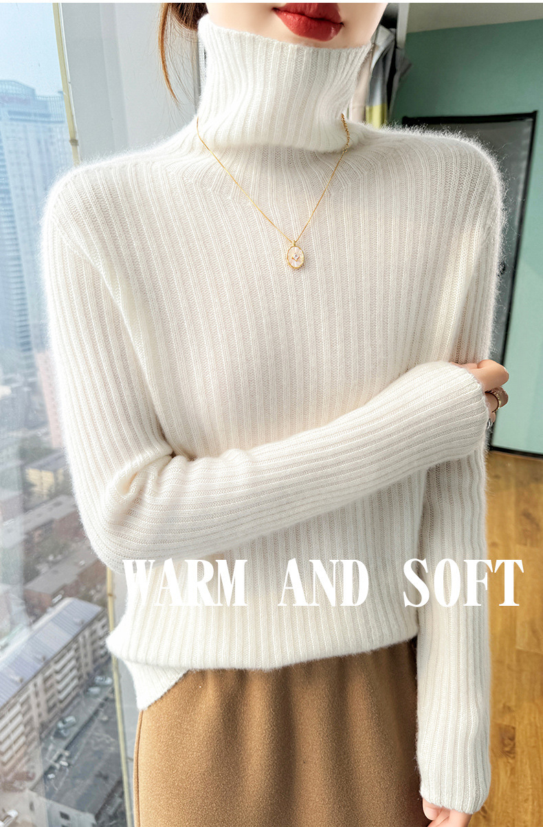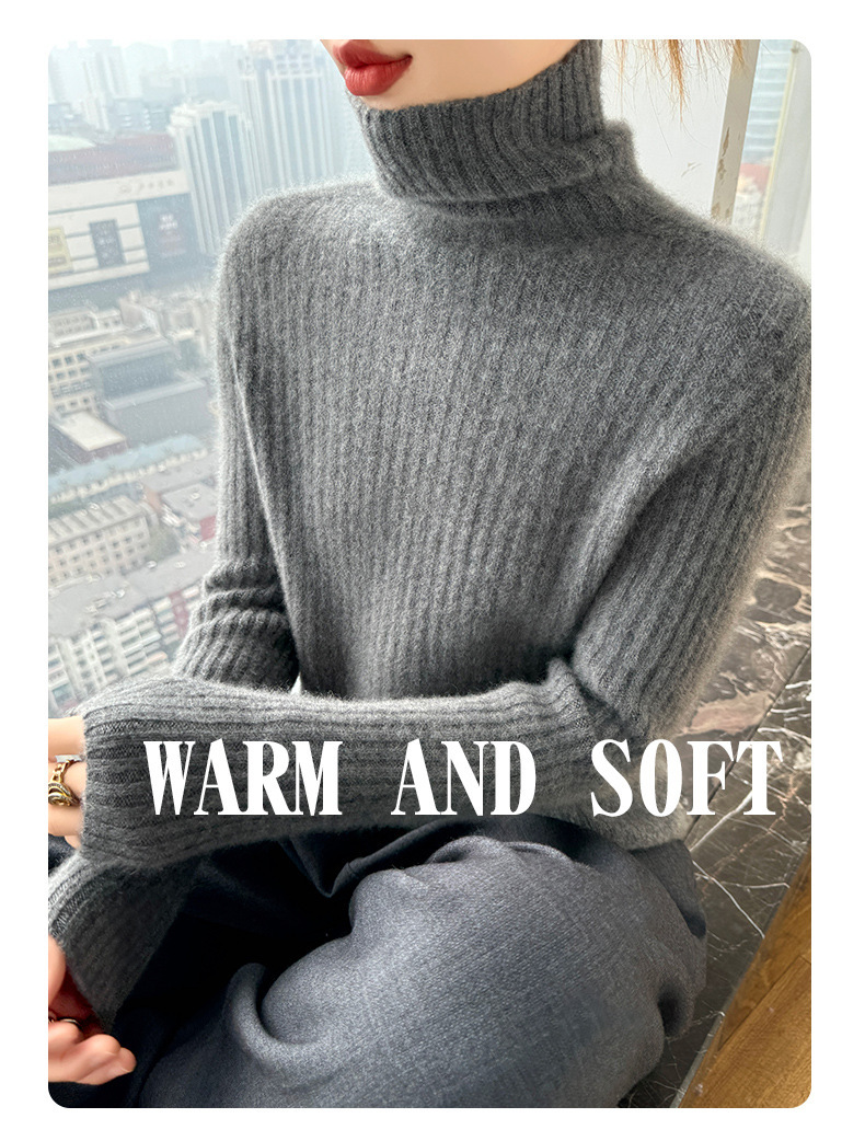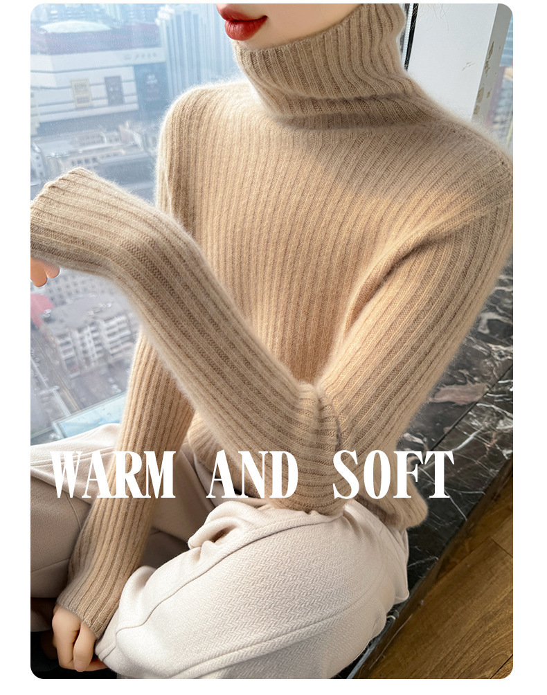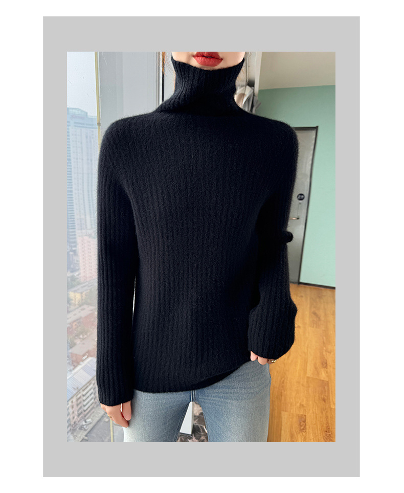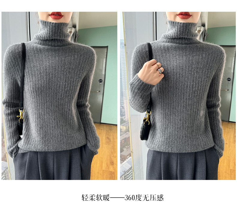 2025年秋冬向けレディースハイネックセーター、ウール100%、ゆったりとしたカジュアルスタイル、袖にスリット入り、ニットカシミヤ素材の厚手インナーセーター