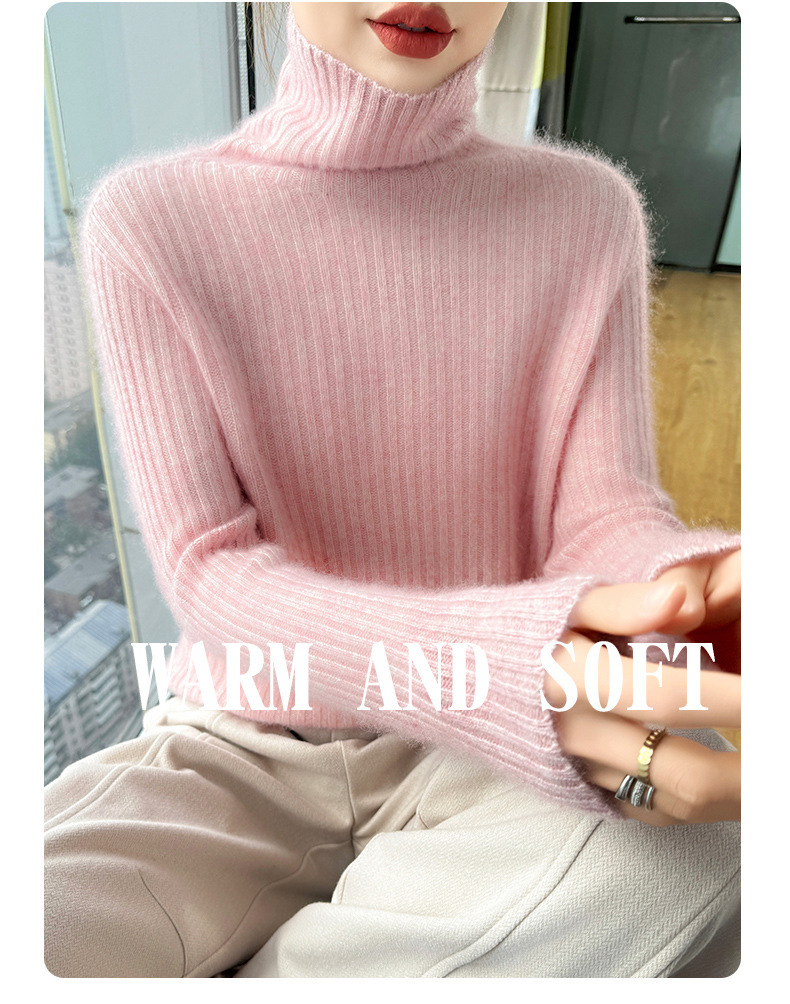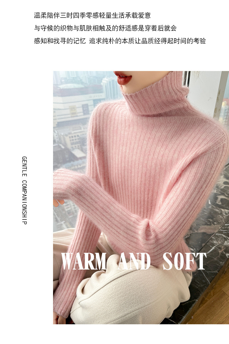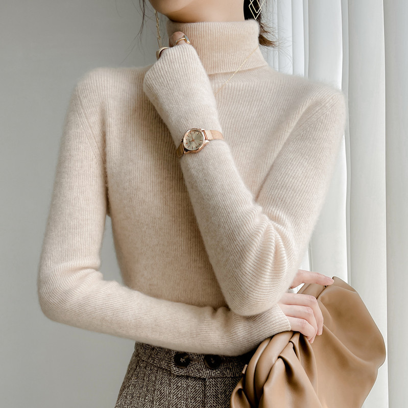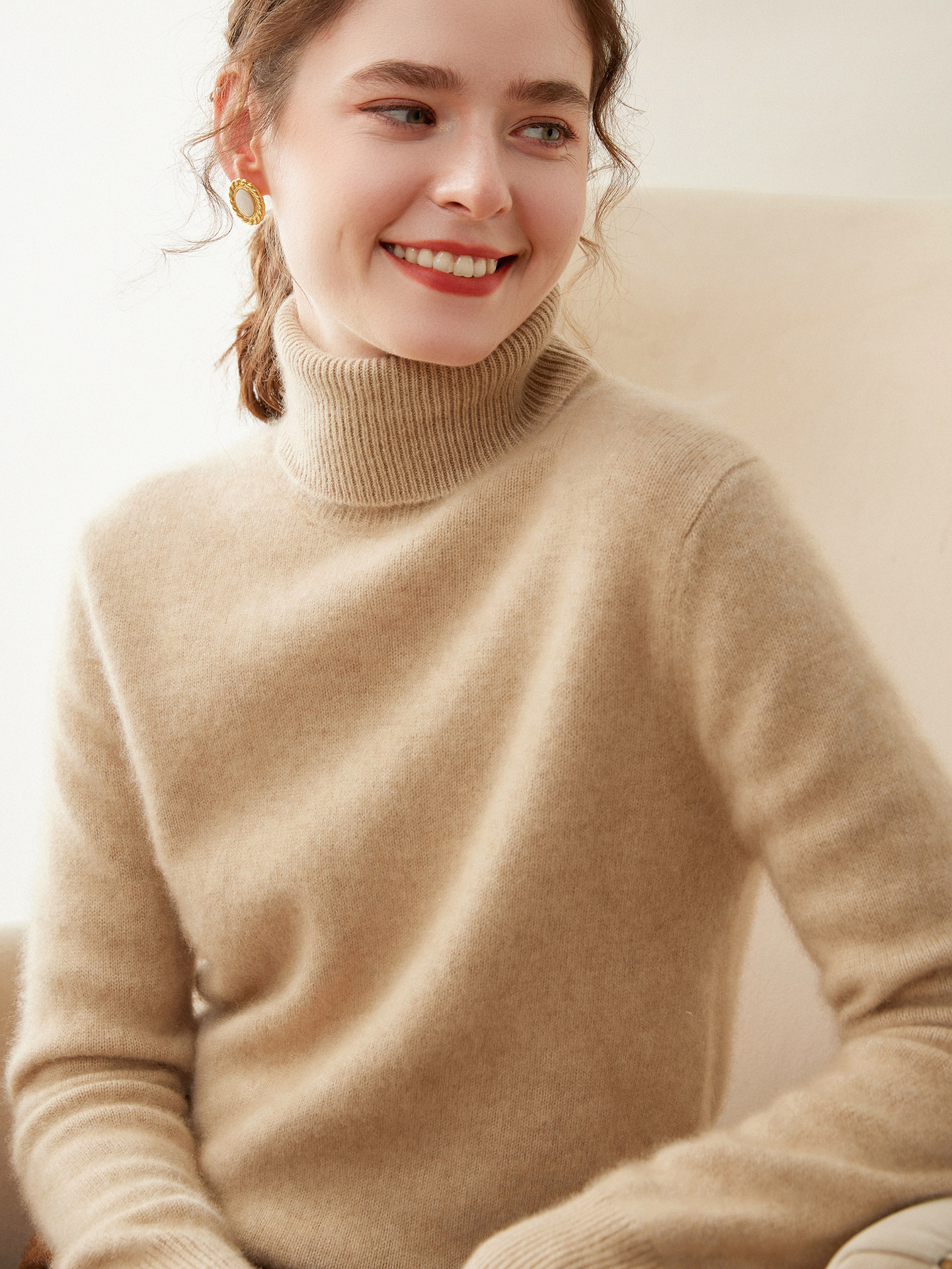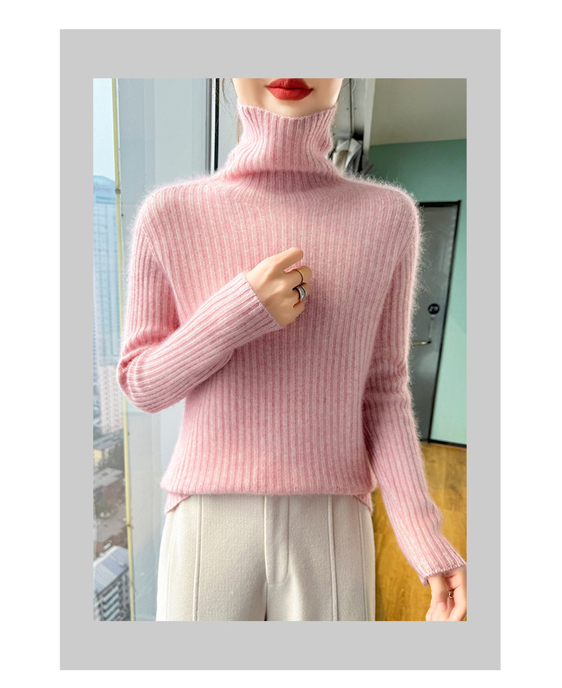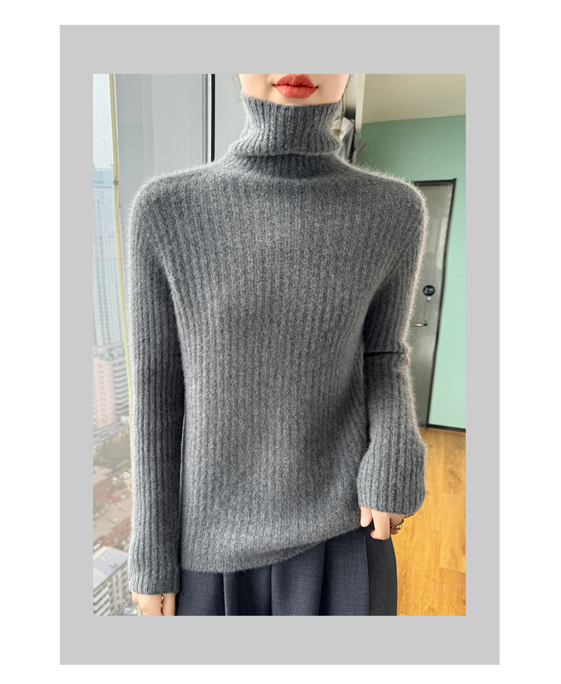 2025年秋冬向けレディースハイネックセーター、ウール100%、ゆったりとしたカジュアルスタイル、袖にスリット入り、ニットカシミヤ素材の厚手インナーセーター