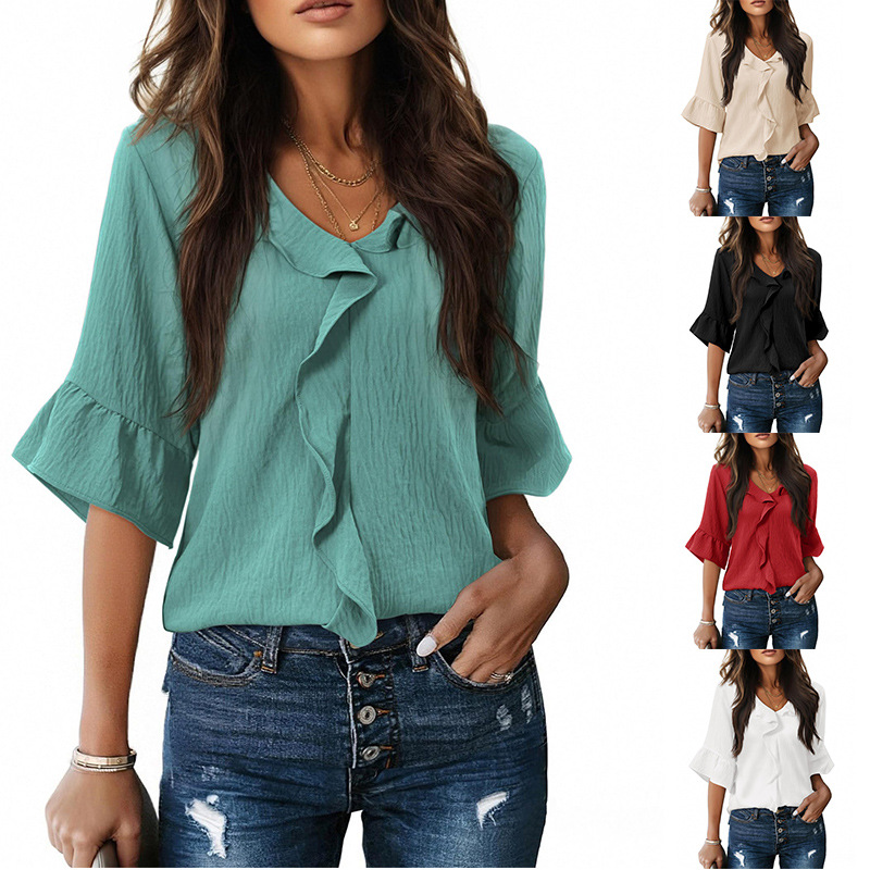 欧美跨境亚马逊TikTok2026时尚款新款3/4 袖口褶边灯笼领休闲上衣