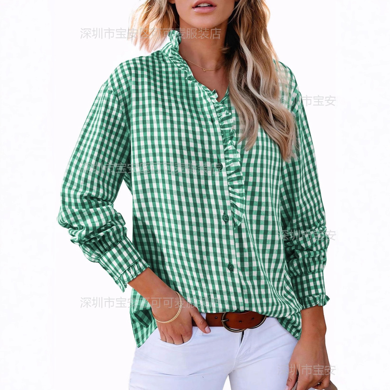欧美跨境外贸亚马逊2025秋季新款格子上衣法式木耳边V领衬衫女