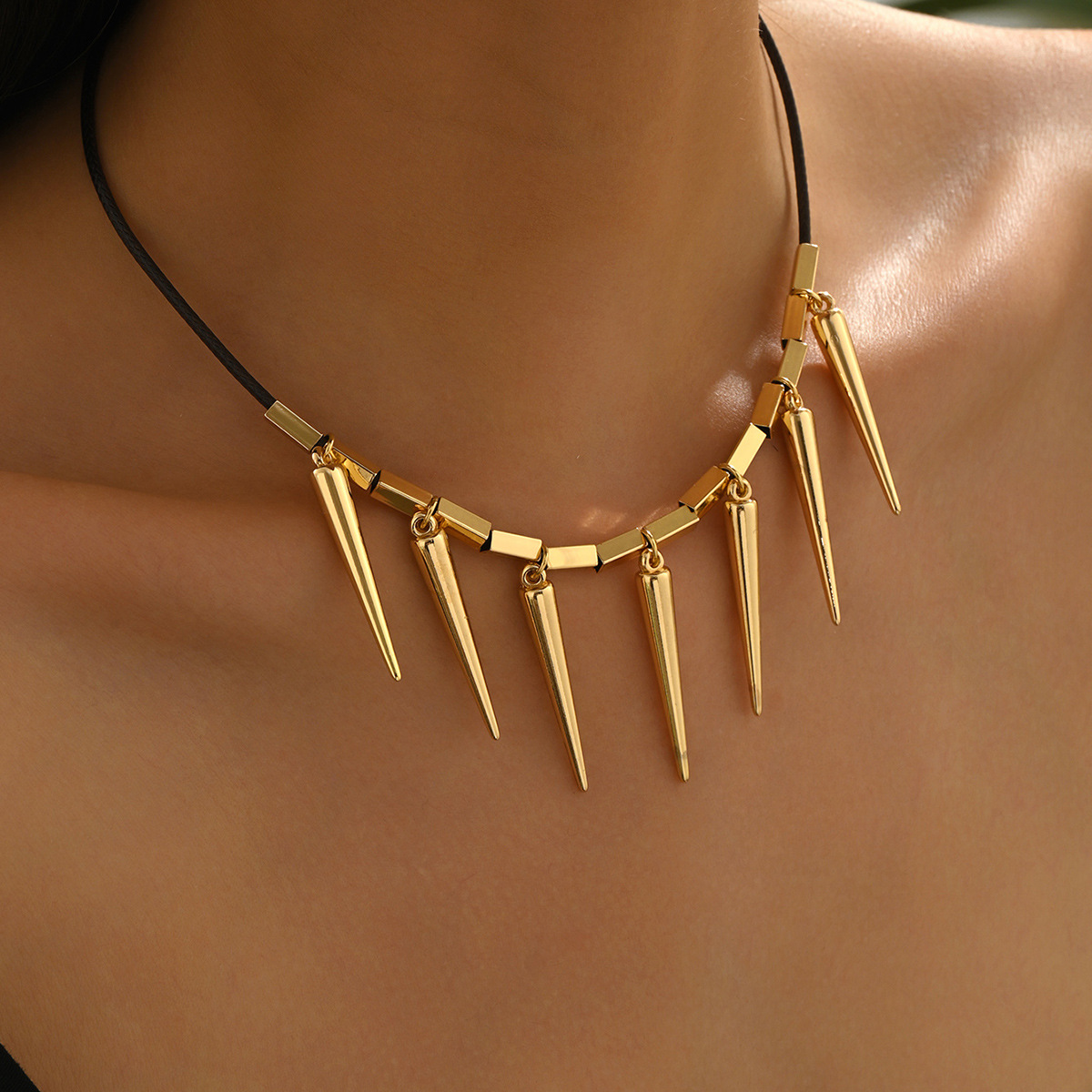 复古哥特风黑色麂皮带搭配朋克金色铆钉挂坠项链锁骨链情侣同款