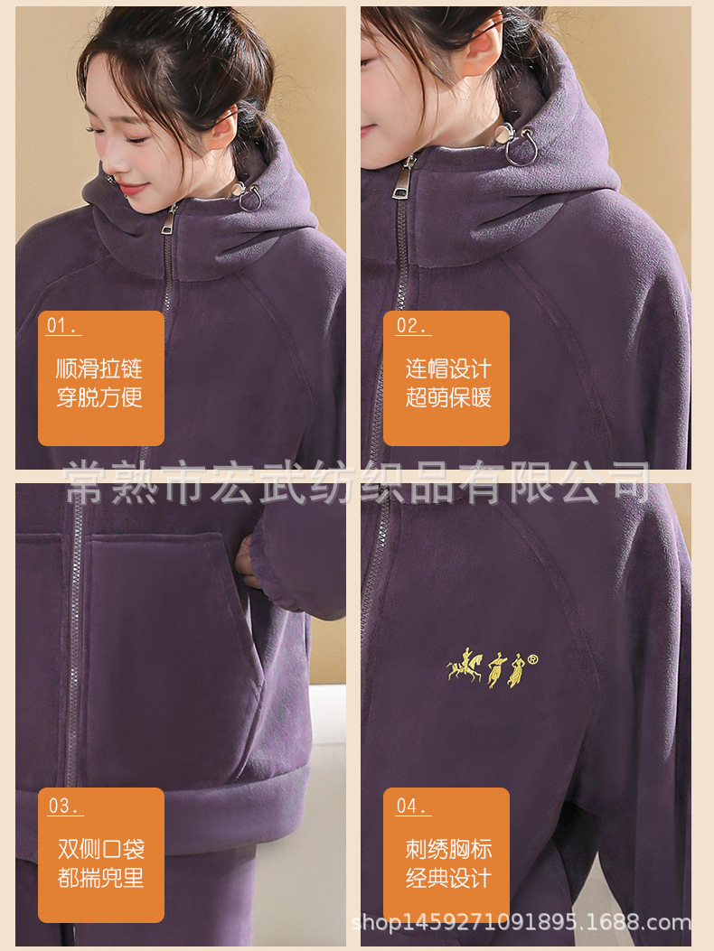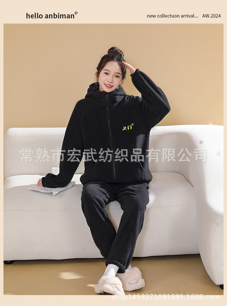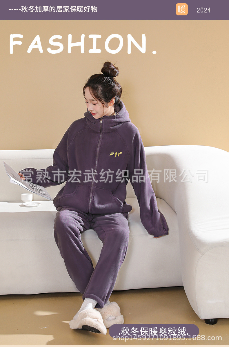 冬季海豚绒女保暖连帽加绒加厚奥利绒休闲宽松可外穿家居服套装