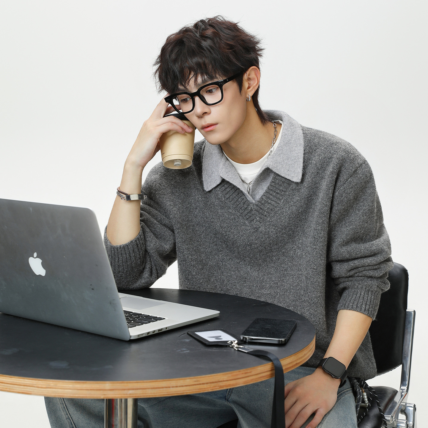 老钱风质感假两件V领毛衣男秋冬新款复古翻领polo针织衫保暖外套