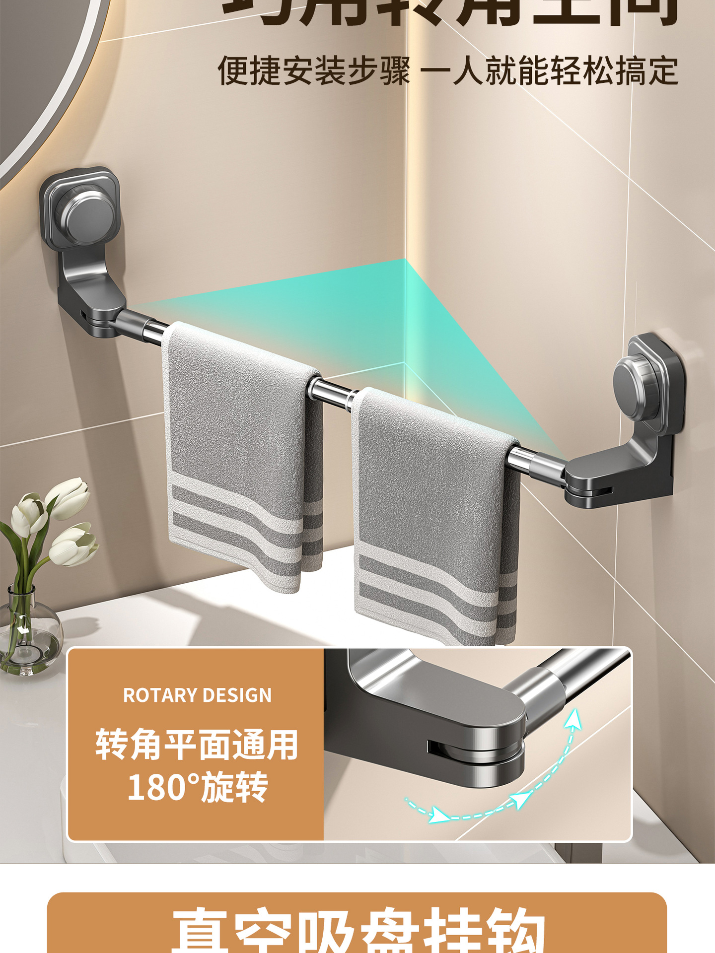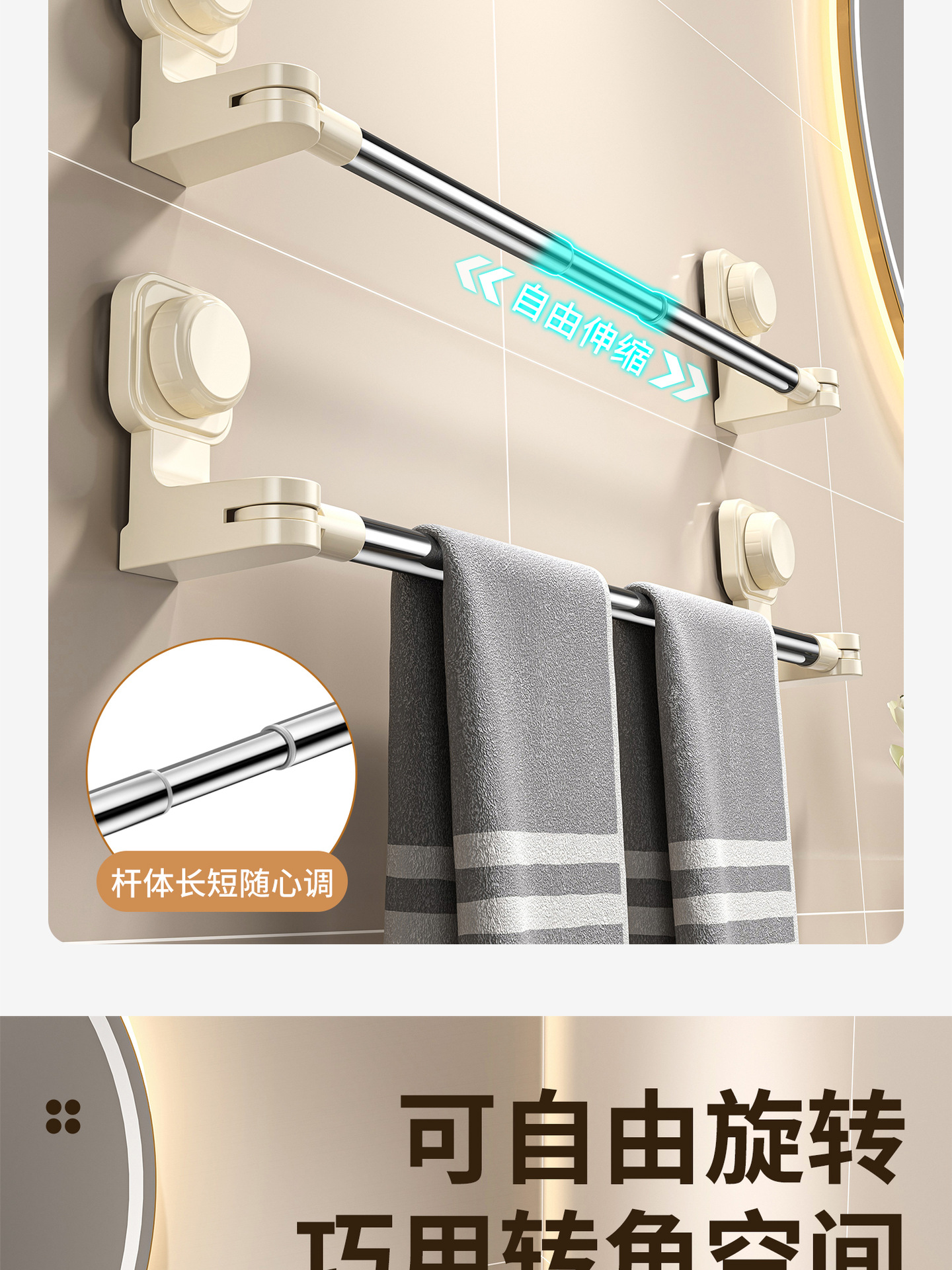吸盘可伸缩旋转毛巾杆卫生间免打孔毛巾架浴室毛巾置物架浴巾挂架
