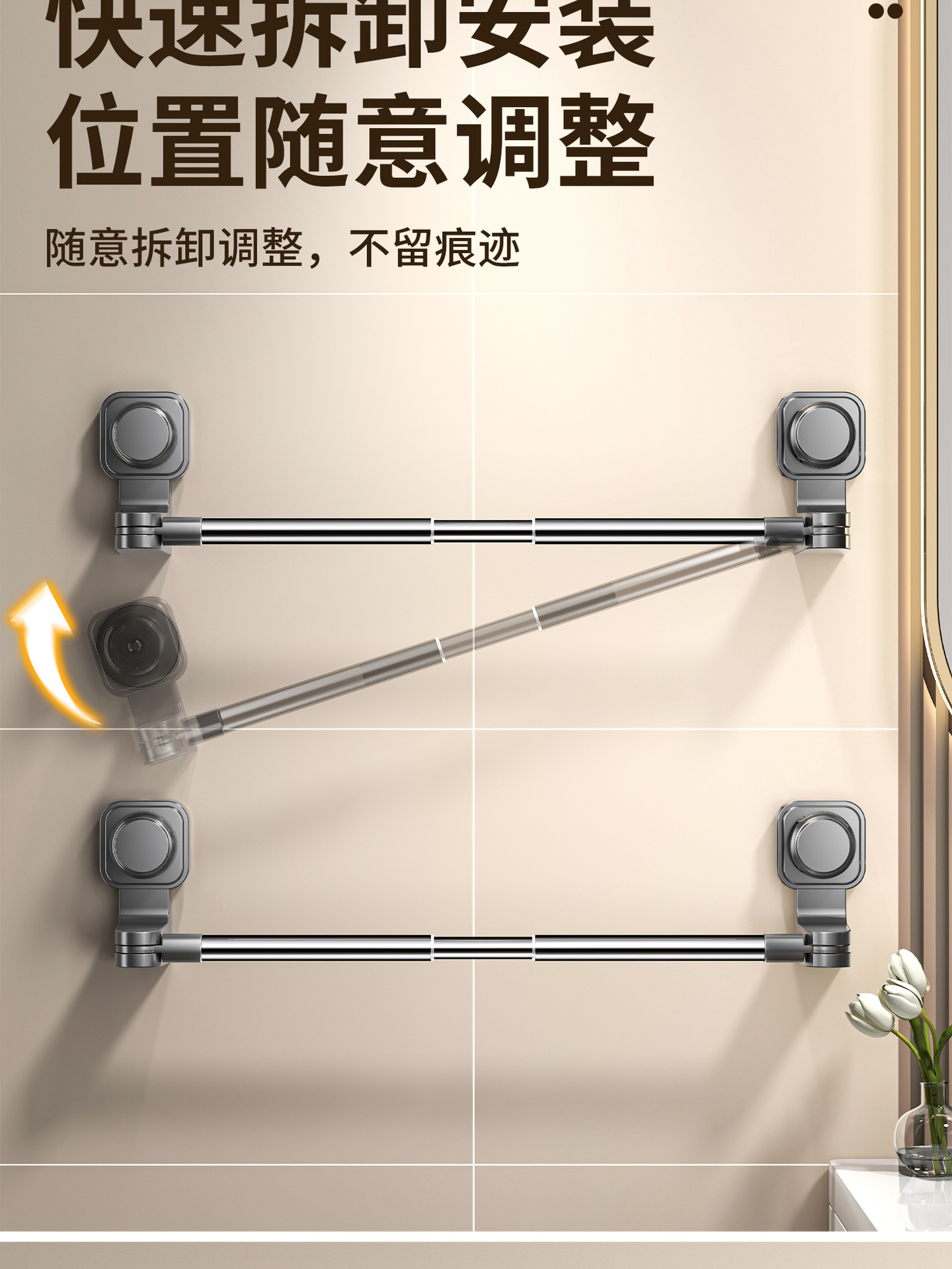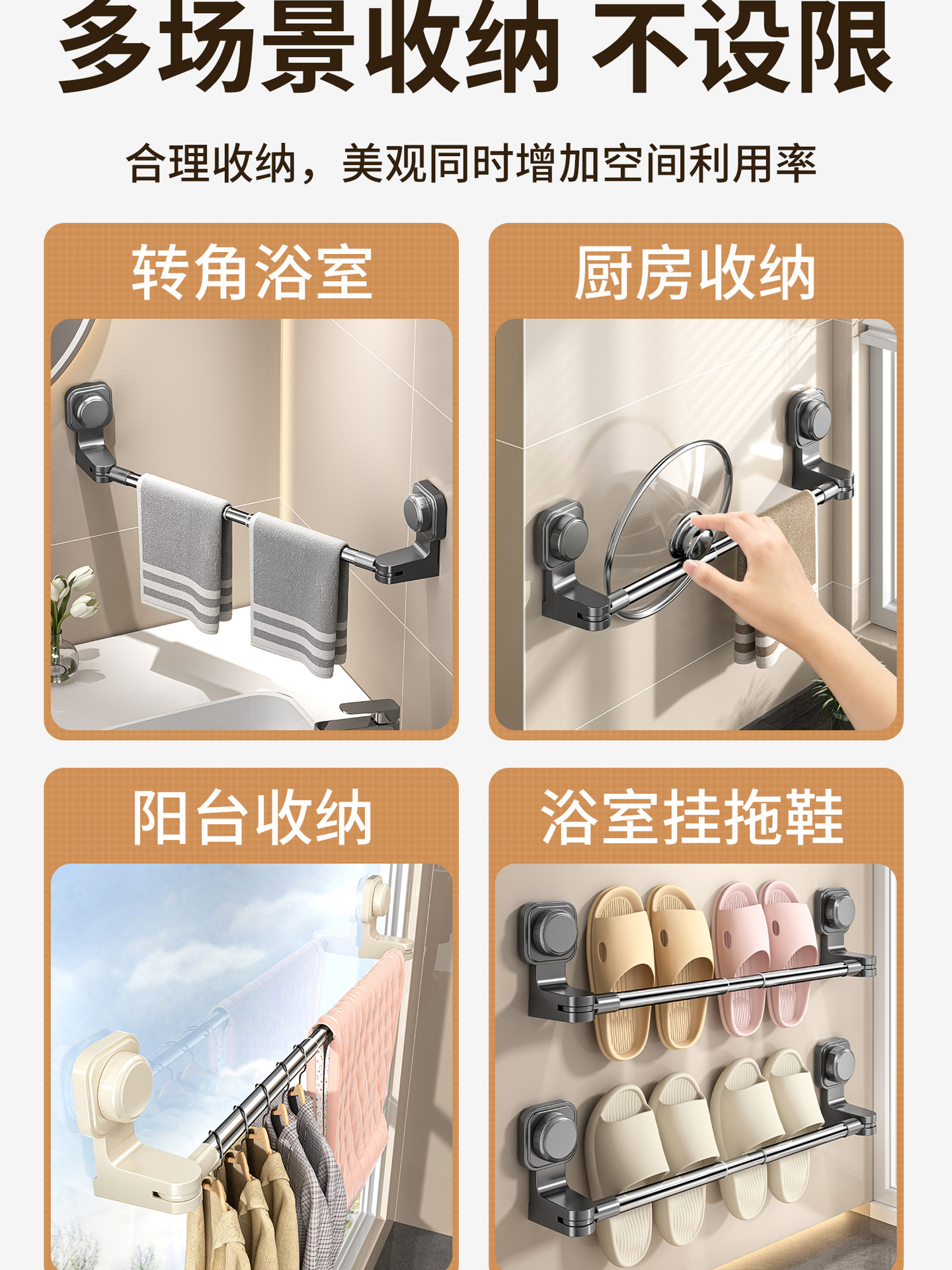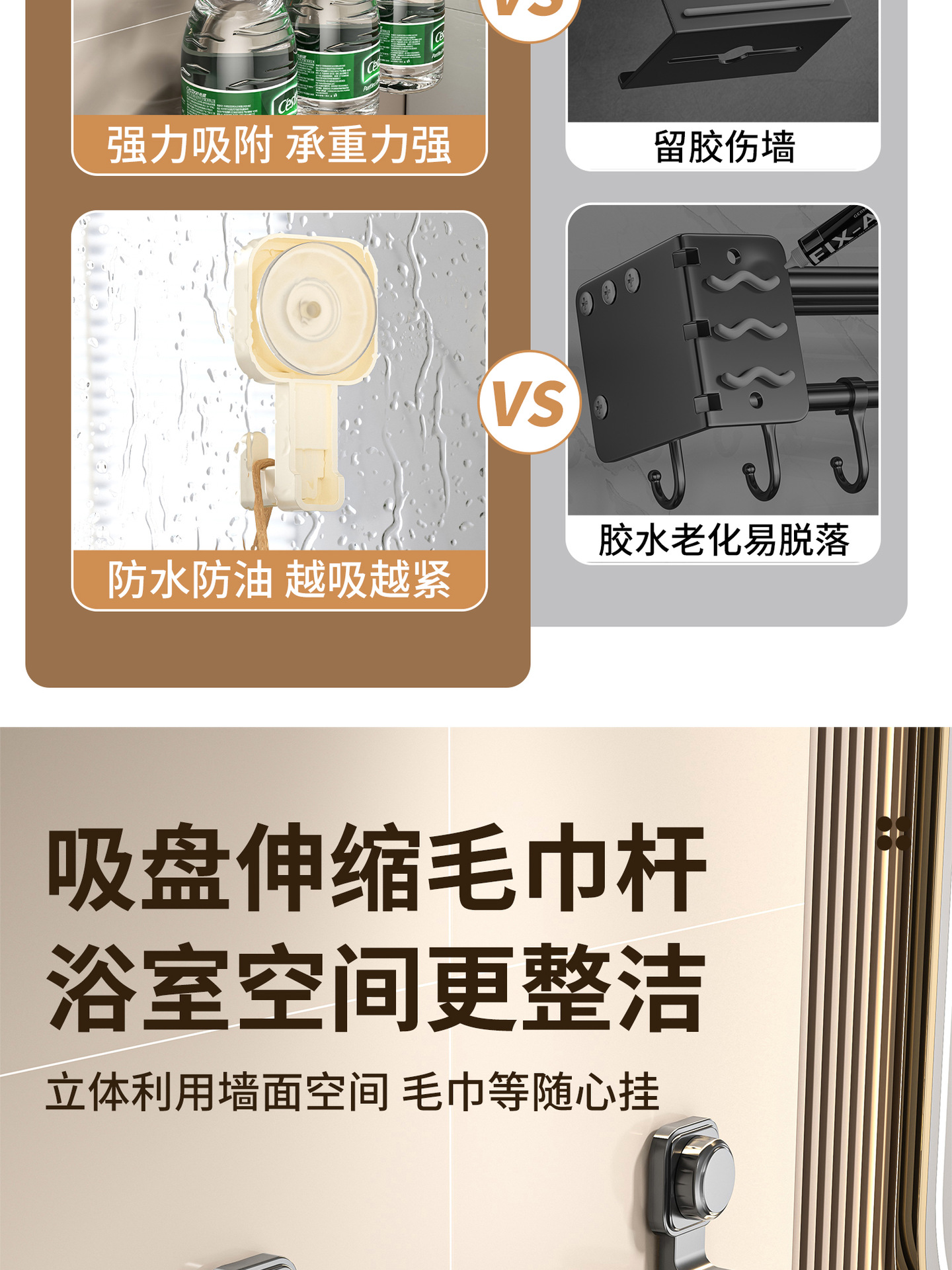 百悍吸盘毛巾架挂杆卫生间免打孔置物架伸缩毛巾杆浴室厕所收纳架