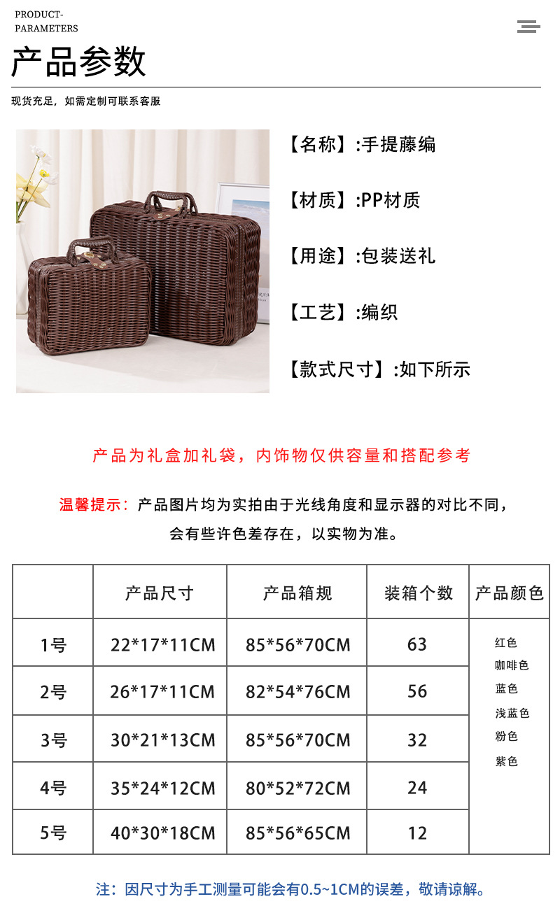 1号:22*17*11CM,2号:26*17*11CM,3号:30*21*13CM,4号:35*24*12CM,5号:40*30*18CM