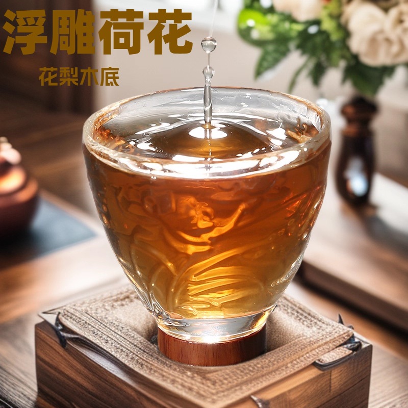 水晶玻璃浮雕荷花杯主人杯功夫茶具品茗杯高档加厚耐热木座茶具杯