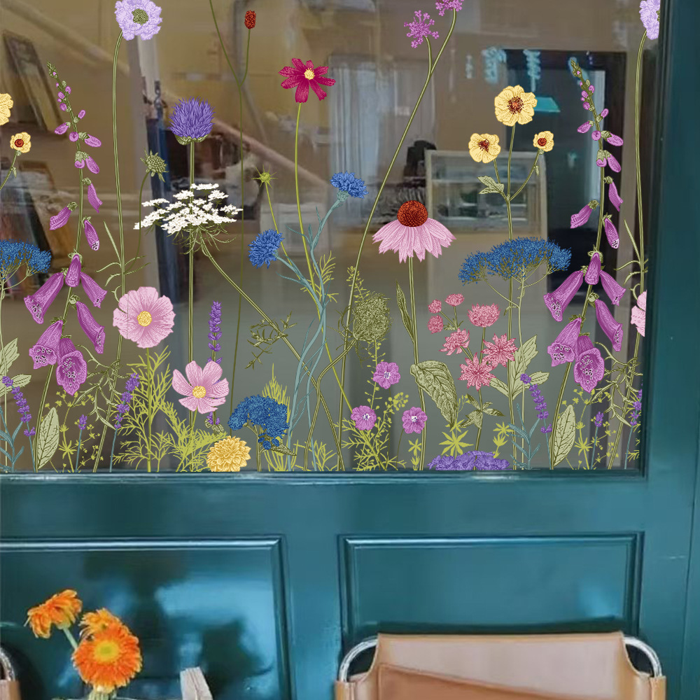 植物の花の店のショーウインドーのガラスの扉のシールの紫色の花の装飾の服の店の窓の花は絵の静電気を貼って貼ります。