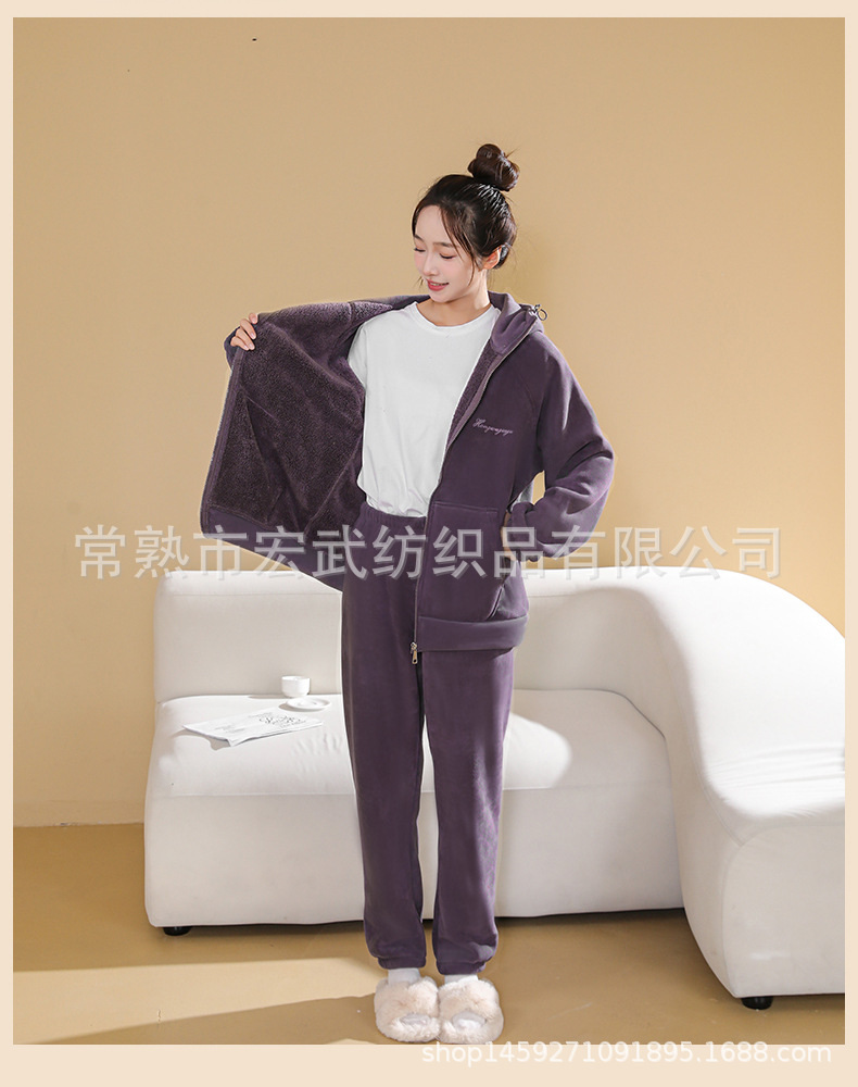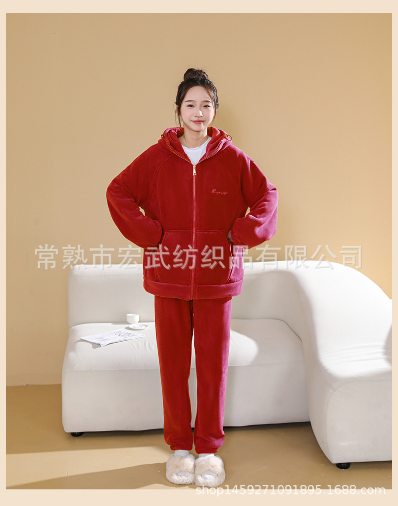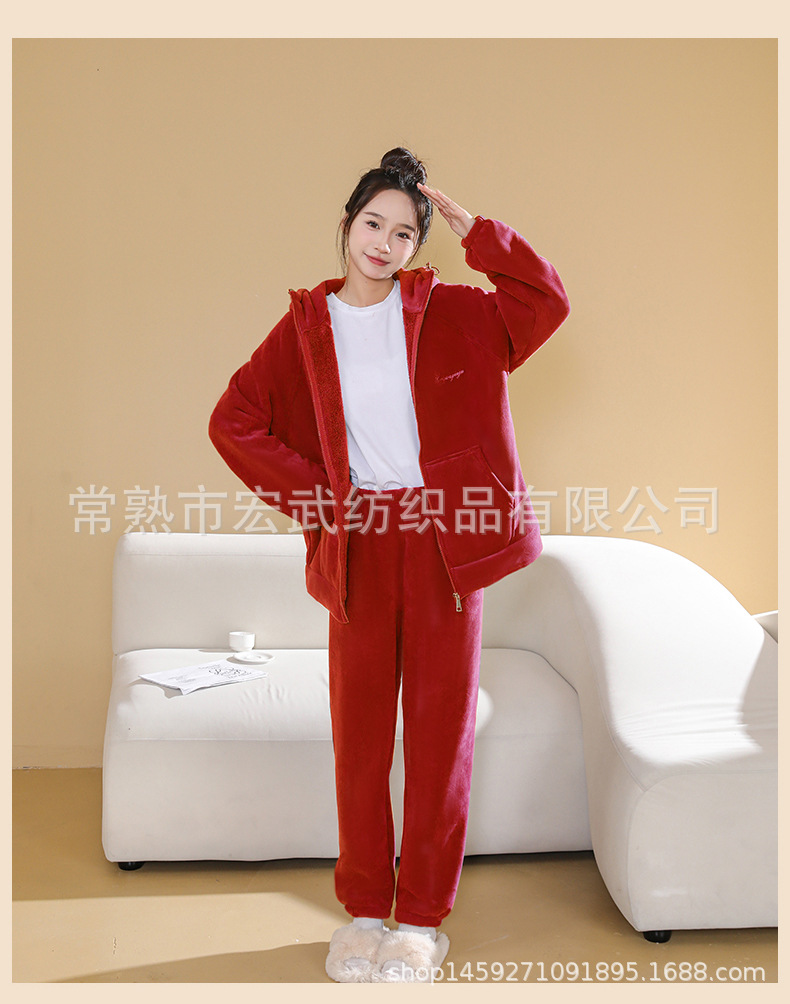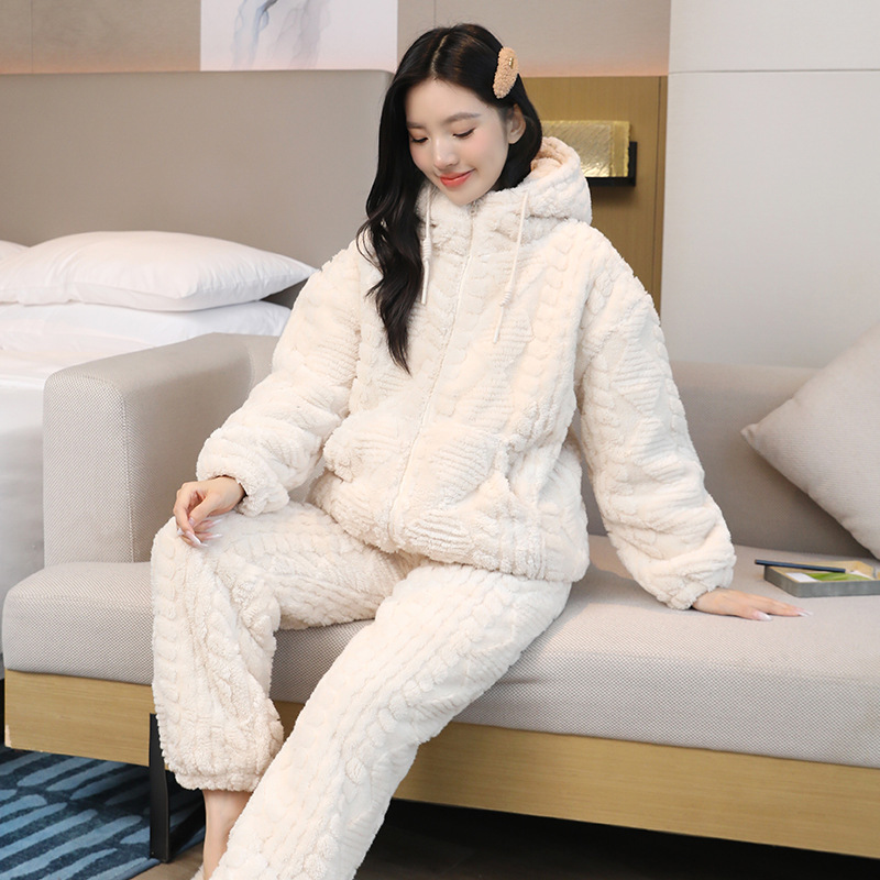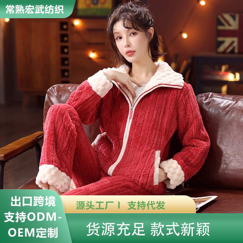 睡衣女冬季珊瑚绒加厚加绒三层夹棉超厚拉链可外穿冬天家居服套装