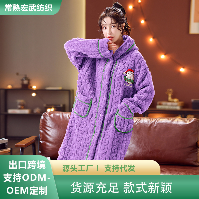 国境を越えてサンゴのベルベットのバスローブを卸売りしている女性は秋冬に帽子をかぶってクリスマスの長いタイプの保温を厚くして家の服のスーツを着ることができる
