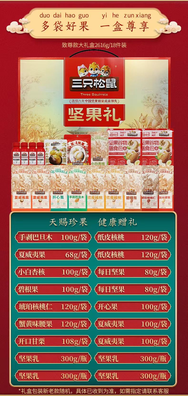 三只松鼠 純ナッツギフトボックス 高級ギフト 2616g/18袋入り 混合ナッツ 健康スナック ギフトボックス 年越しギフト