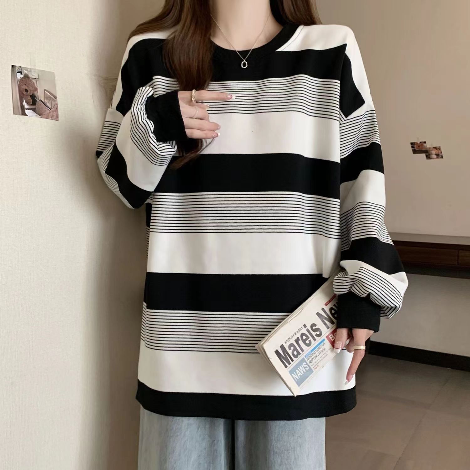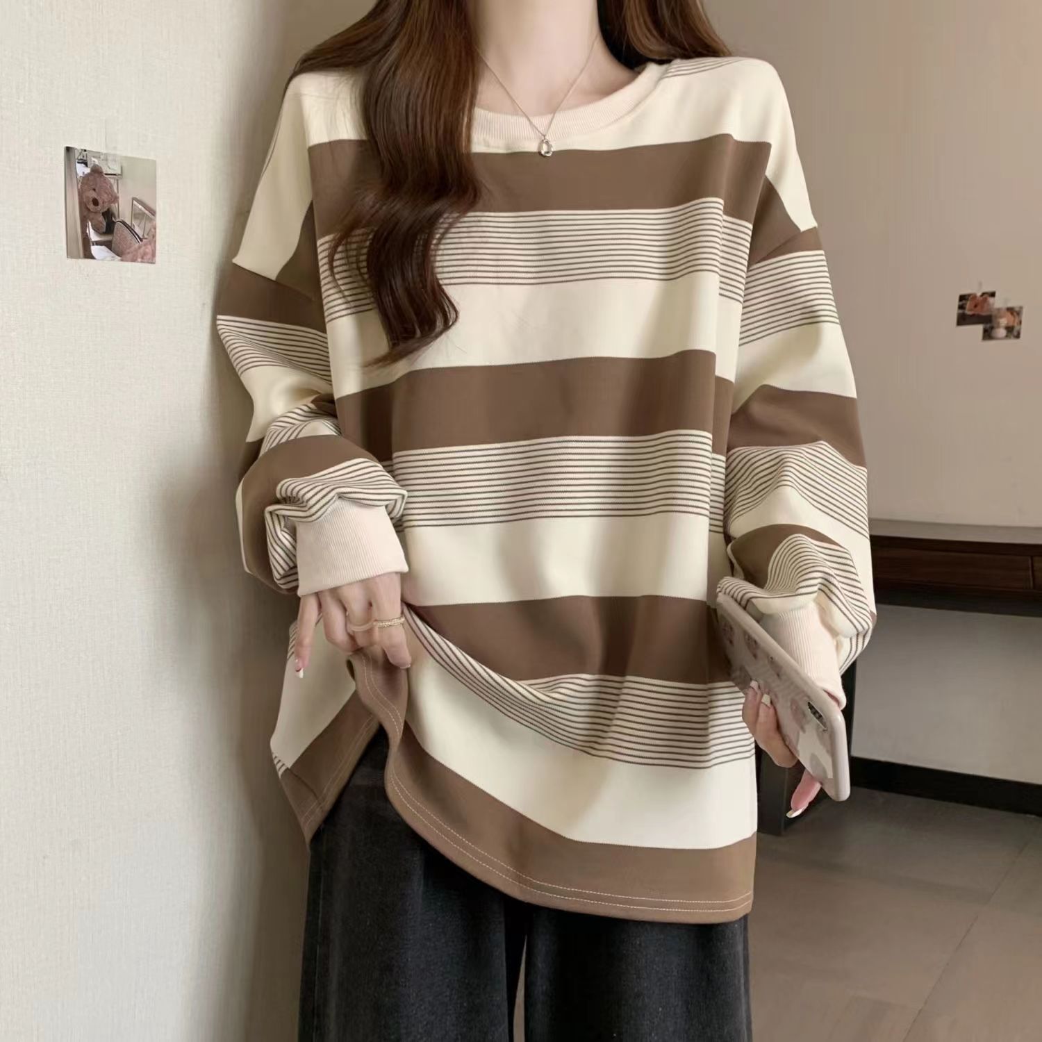 2025年秋の新作デザイン、ゆったりとしたカジュアルな大きいサイズのレディース服、ラウンドネックのストライプ柄長袖Tシャツ、女性向けトレンド