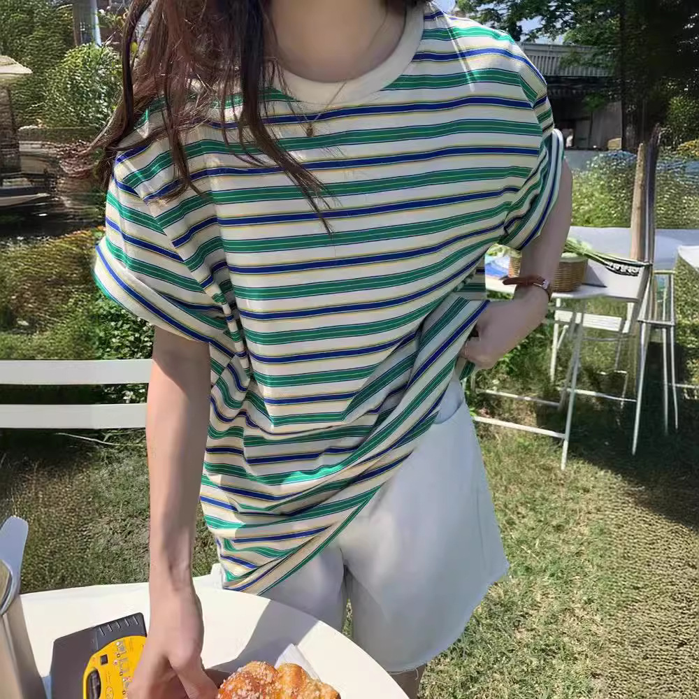 白緑の縞模様のtシャツの女性半袖夏2023年の新しい薄い上着のゆるい丸首半袖tシャツ