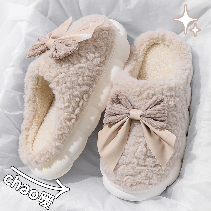 新しい綿のスリッパの女性のタイプの冬の家庭用の保温の外は滑り止めの厚い底の蝶結びの毛のスリッパの女性の卸売りを着ます。