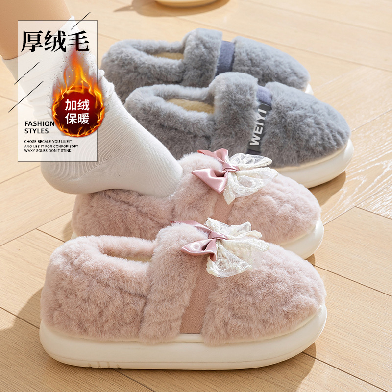 蕾丝蝴蝶结毛毛拖鞋冬季全包休闲防滑情侣居家保暖甜美棉拖鞋批发