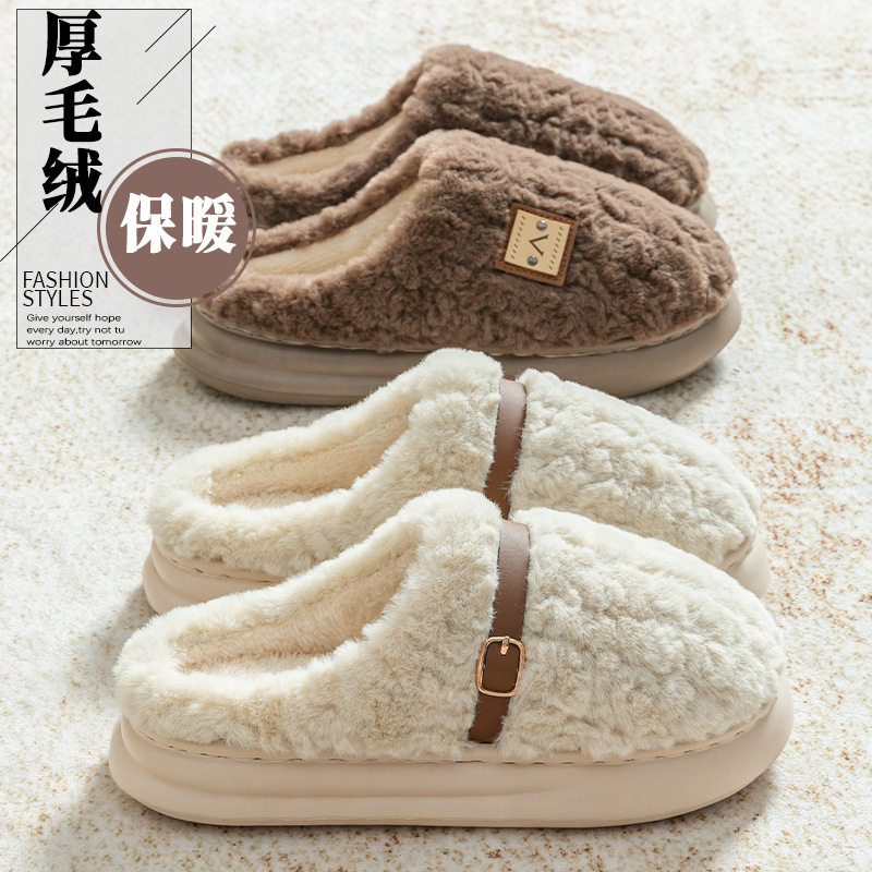韩式皮带扣毛绒棉拖鞋情侣款冬季加绒加厚保暖防滑外穿棉拖月子鞋