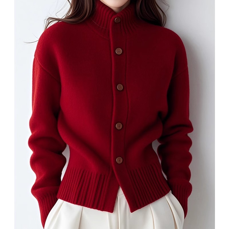 山力達迪ファッション洋気高襟ニットカーディガン女性秋冬新作ゆるい美しい赤いセーターコート長