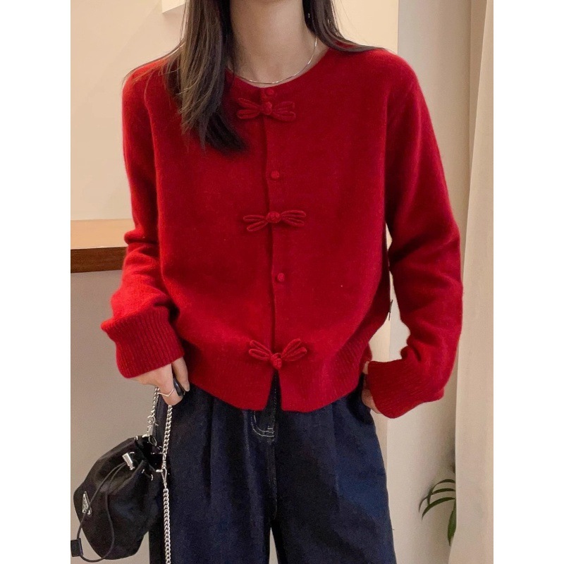 新年战袍红色毛衣外套女冬季大码胖mm新中式国风慵懒针织开衫上衣