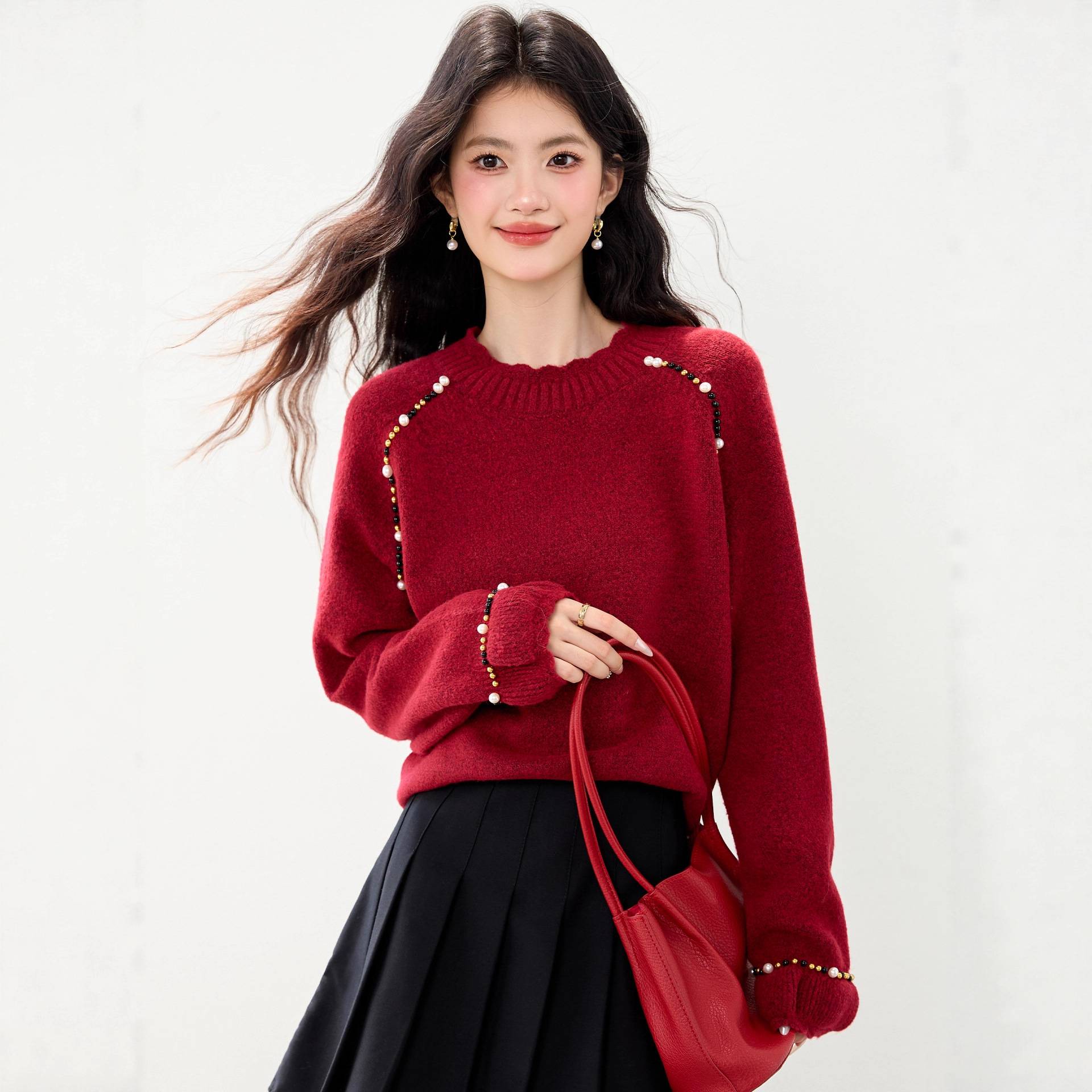 新年红色毛衣女装秋冬慵懒高级感重工钉珠洋气内搭打底针织衫上衣