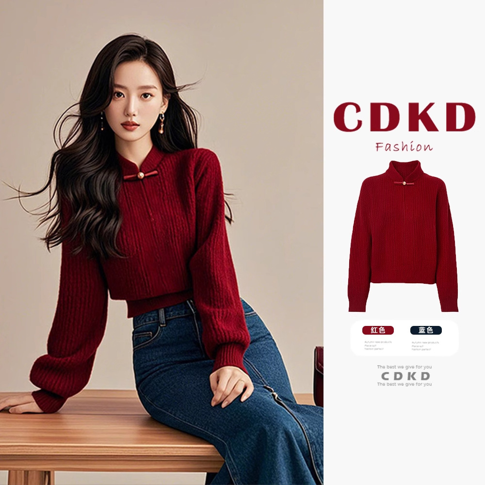 新しい中国風のボタン付きレッドニットボトムシャツ、女性用、春のインナーレイヤリングシャツ、ドーパミンウェアトップ