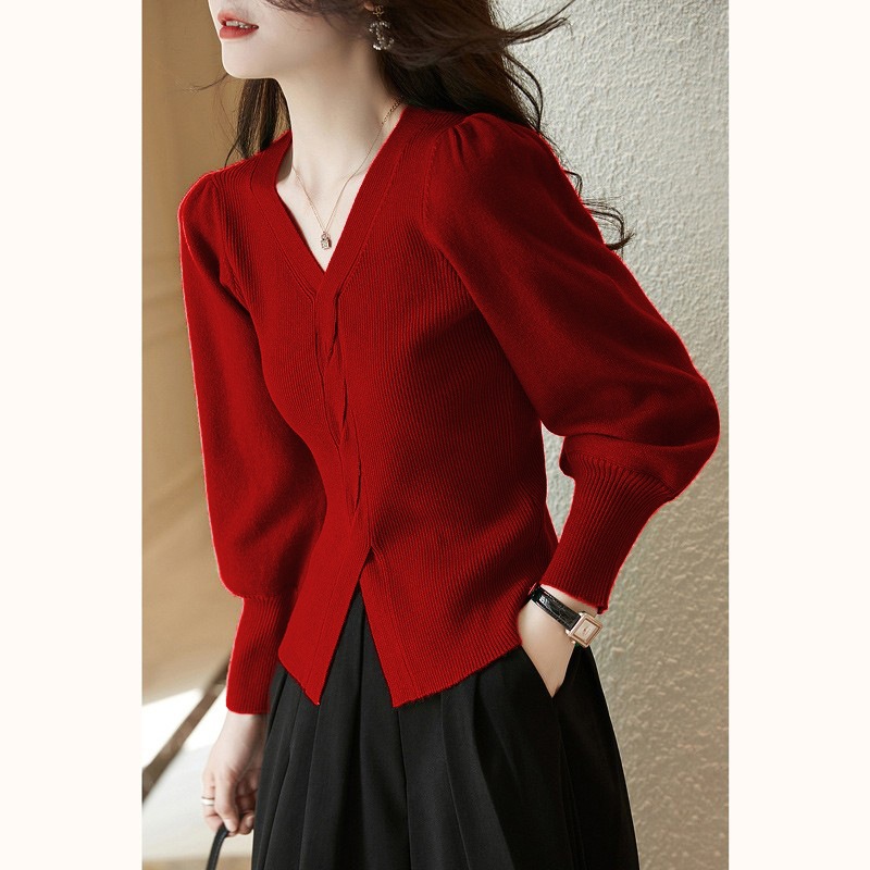 フランス風の気質の赤いvネックのフォークのニットの洋風の秋冬の新型の短いタイプの泡の袖のカバーの頭は肉を遮ります