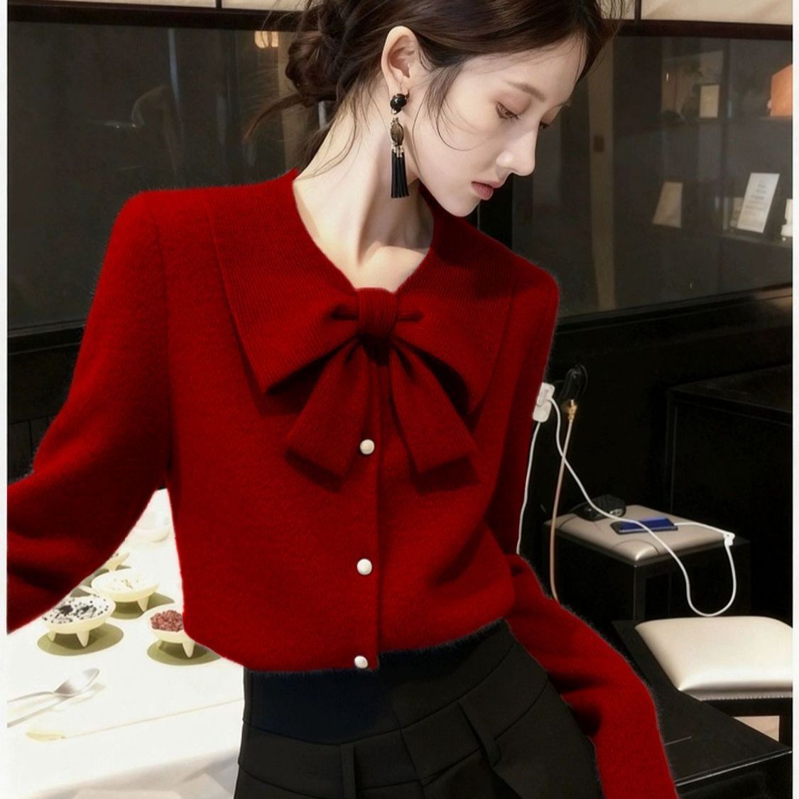 高级感御姐风短款时尚减龄针织开衫秋冬新款红色蝴蝶结翻领毛衣女
