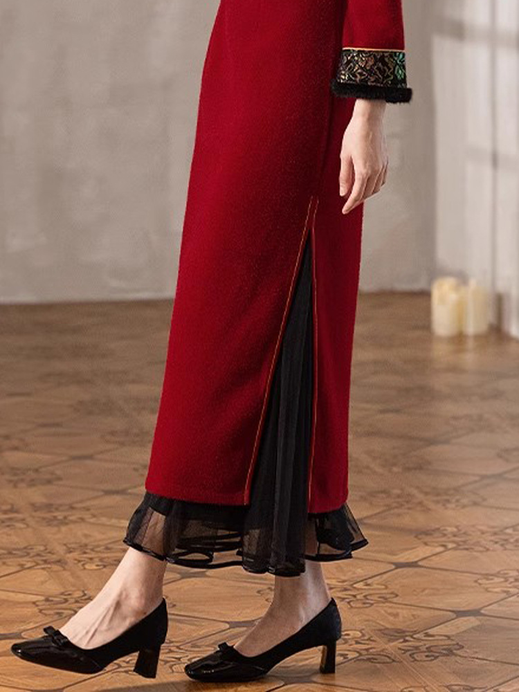 洛士博:月腕凝 温柔清雅双色重工刺绣马甲秋冬旗袍裙子套装女
