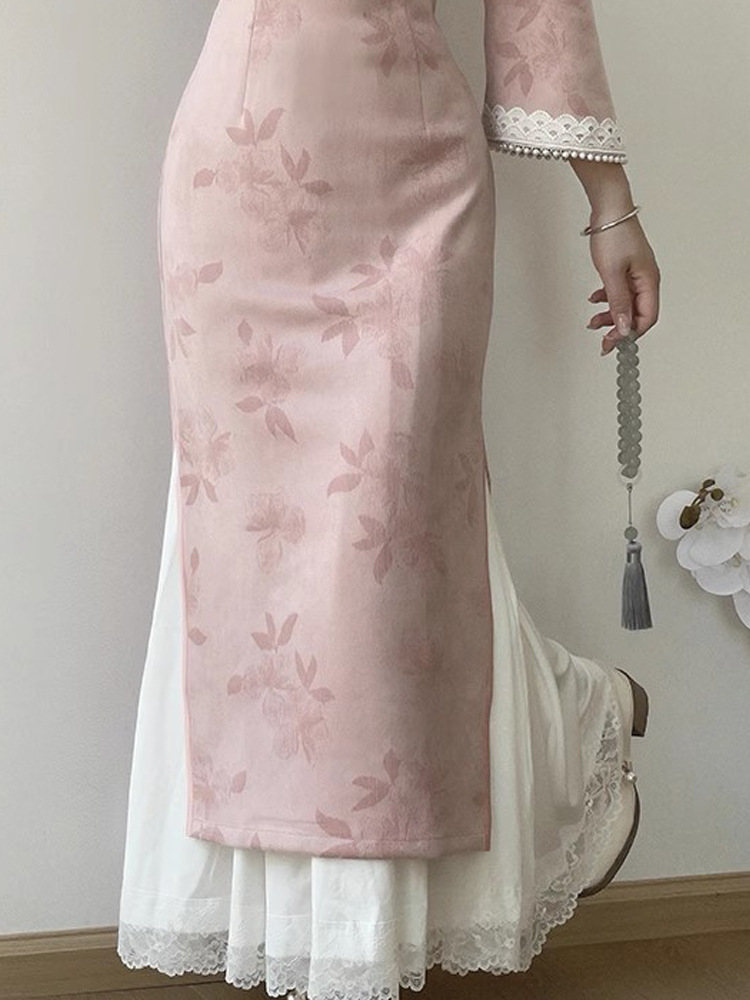 洛士博绝美麂皮绒粉色旗袍2025秋季日常淑女范气质连衣裙女