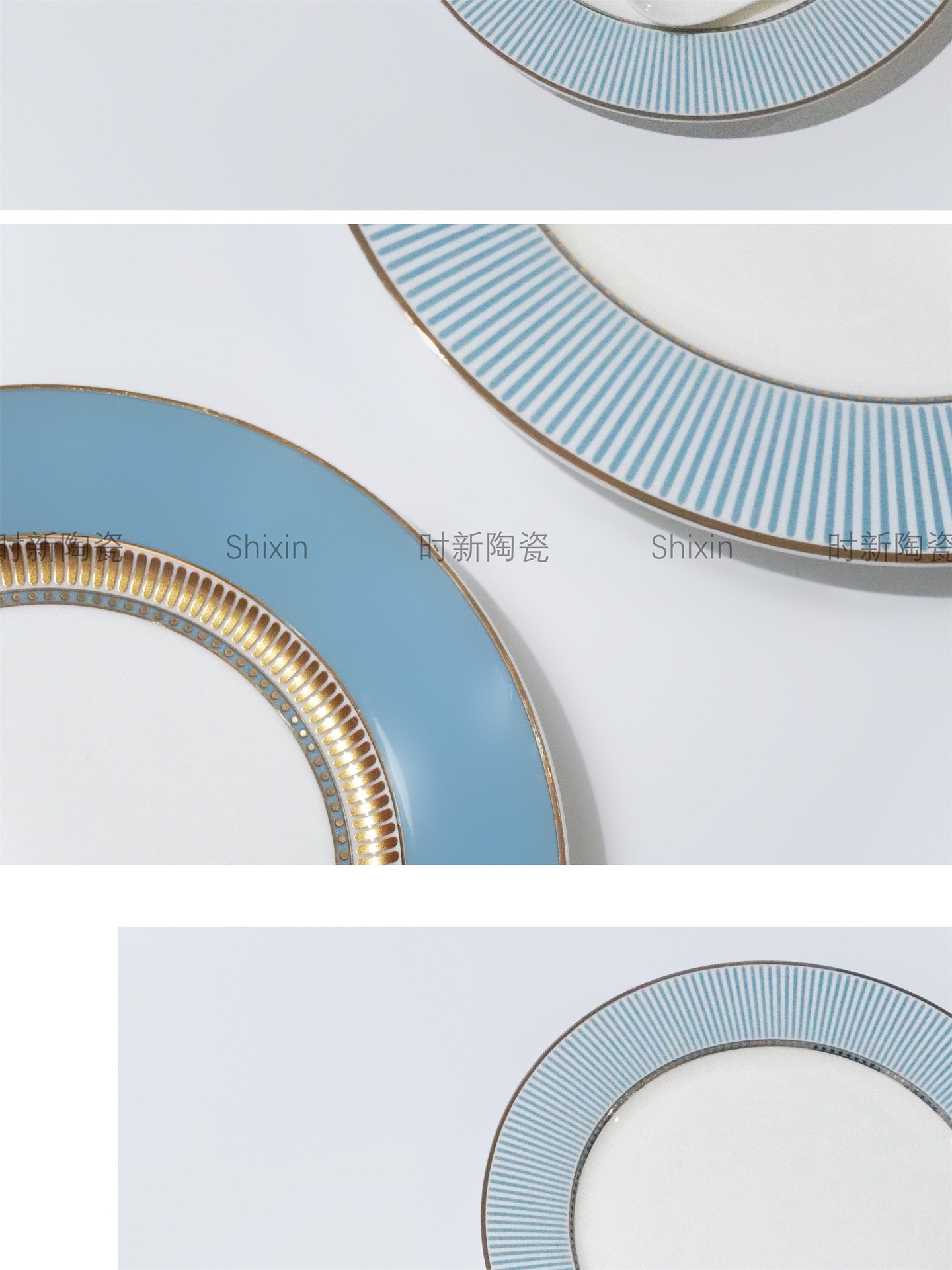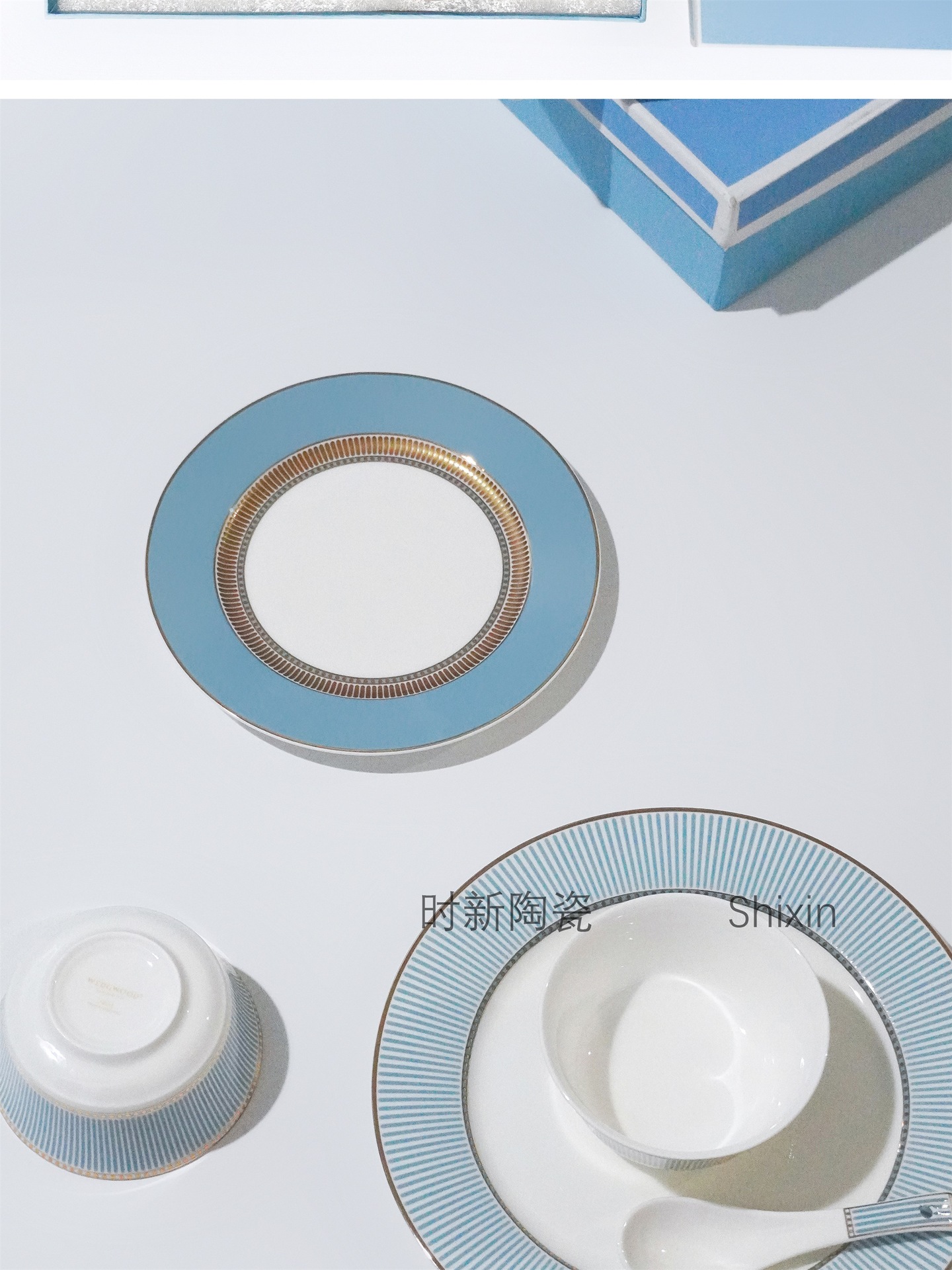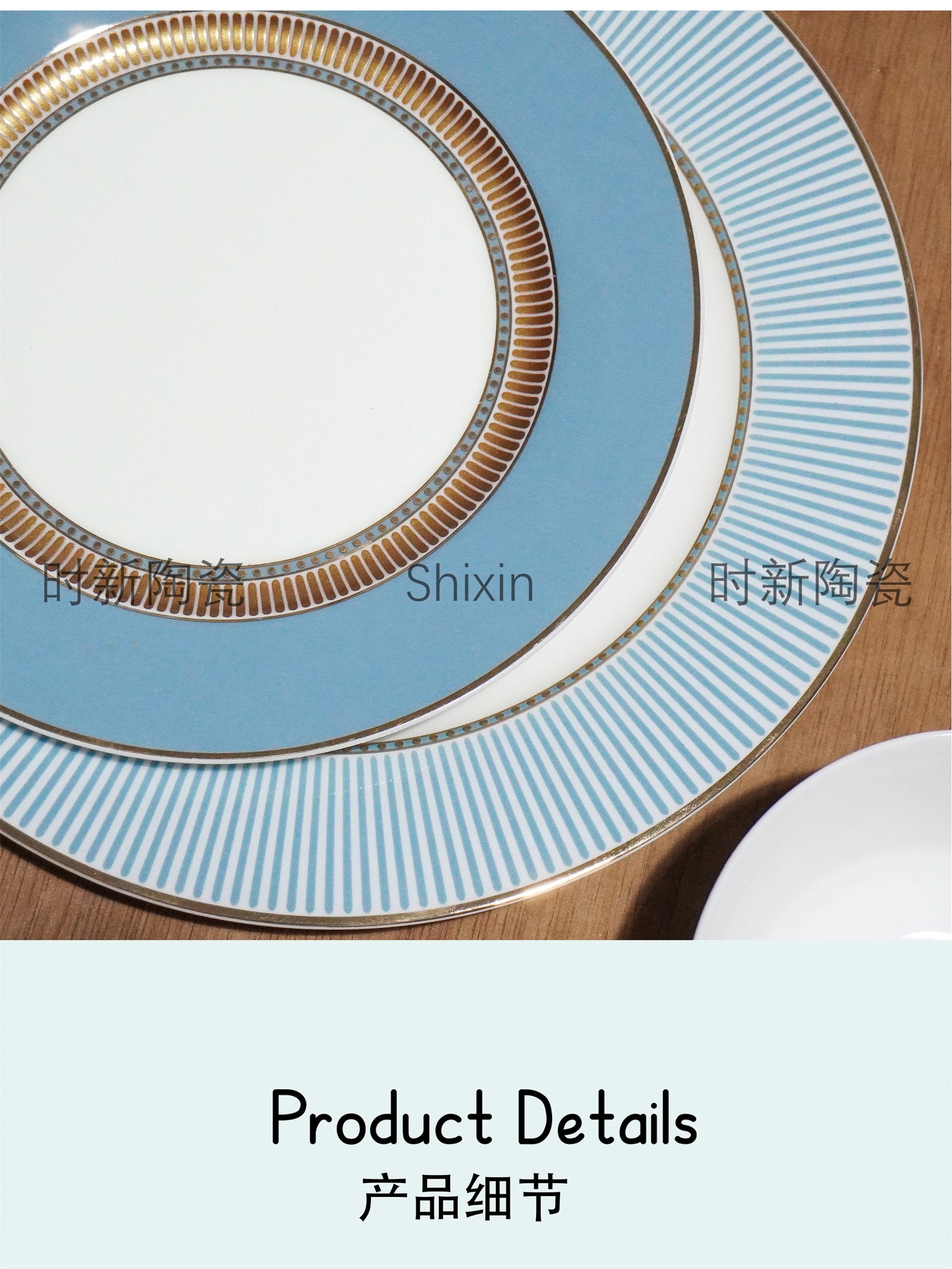 シンプルな空色の縞模様の骨磁器の食事皿W家の高級な新しい家庭用金辺の皿の高級な陶磁器の料理皿