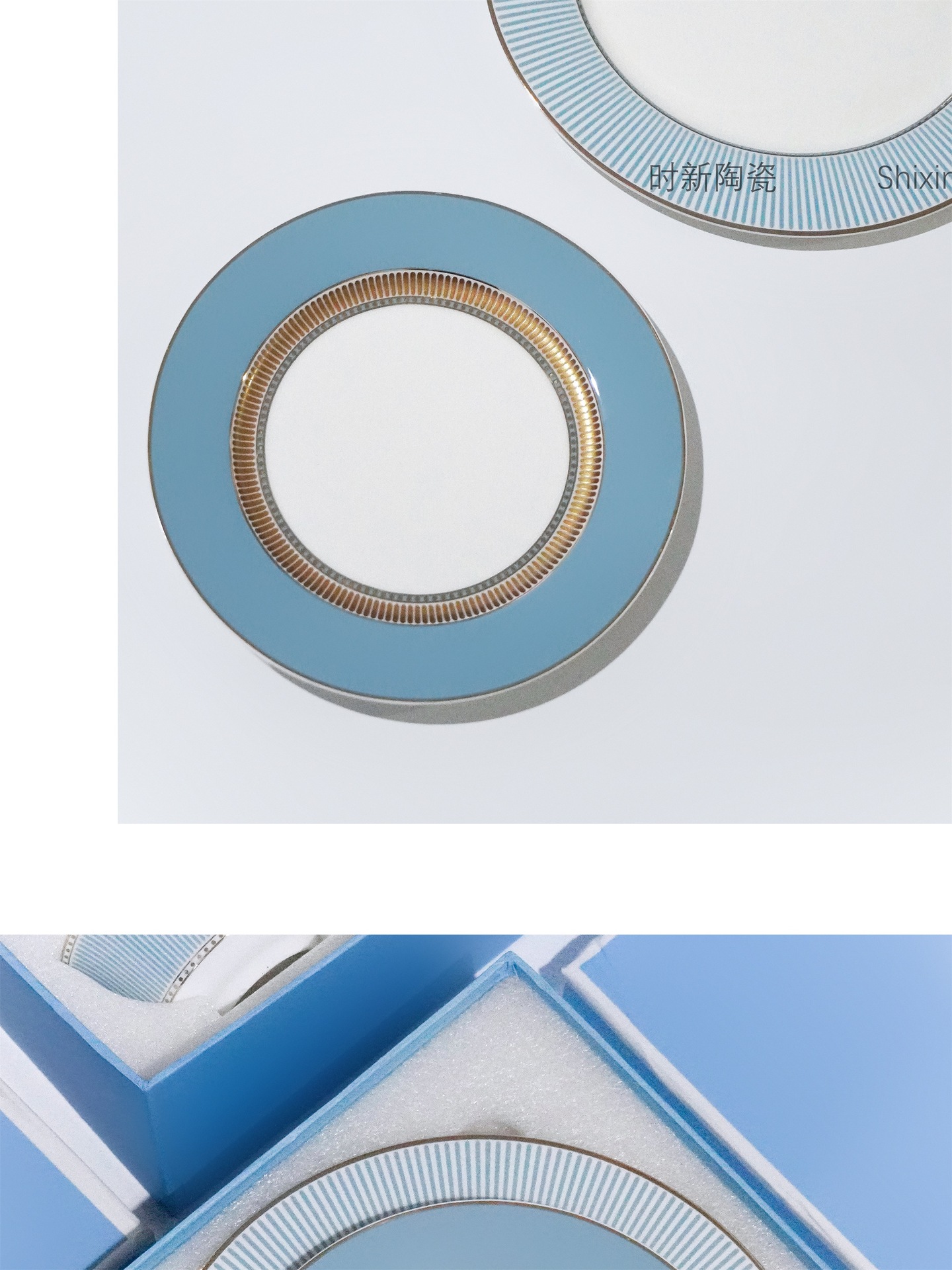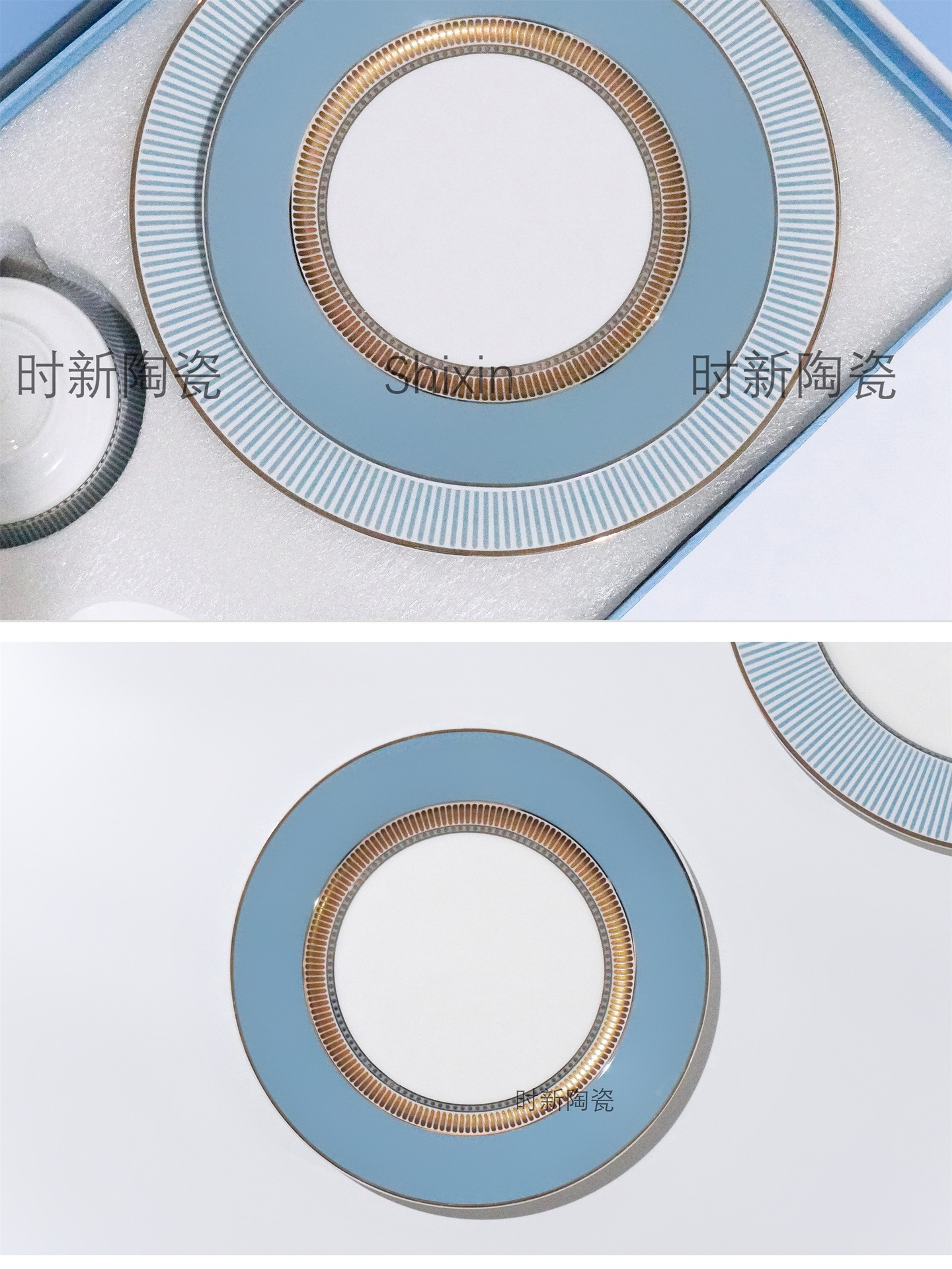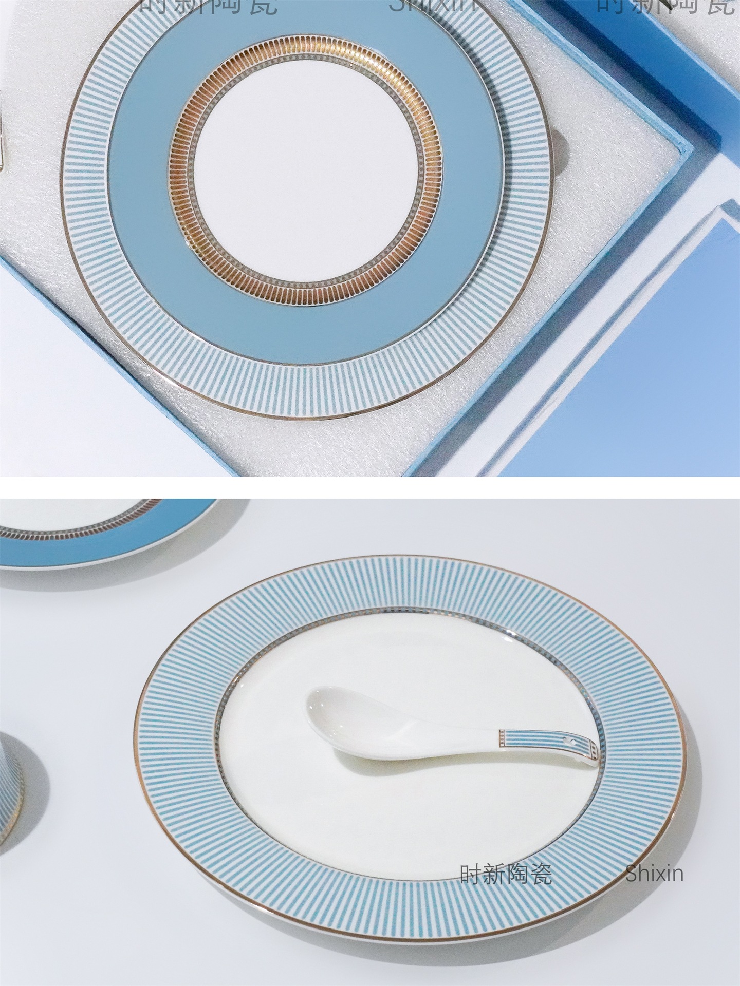 シンプルな空色の縞模様の骨磁器の食事皿W家の高級な新しい家庭用金辺の皿の高級な陶磁器の料理皿