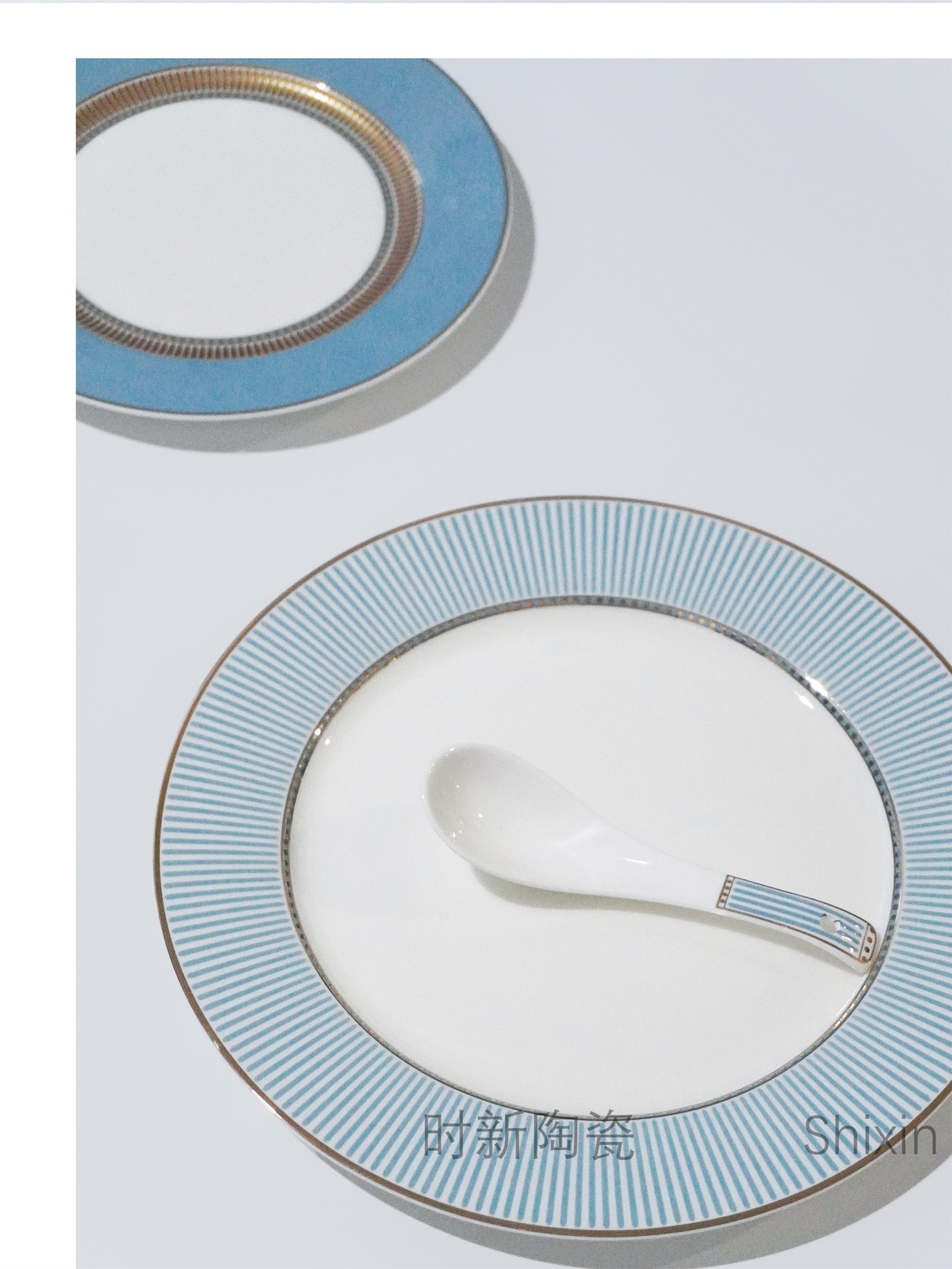 W家のシンプルな空色のストライプの骨磁器の食事皿の高級な新型の家庭用の金辺の皿の高級な陶磁器の料理皿
