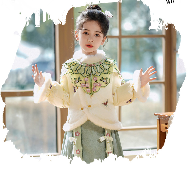漢服女児用ダウンジャケット、子供用正月服、中国風唐装、2025年冬新作、新年馬面裙、秋冬服