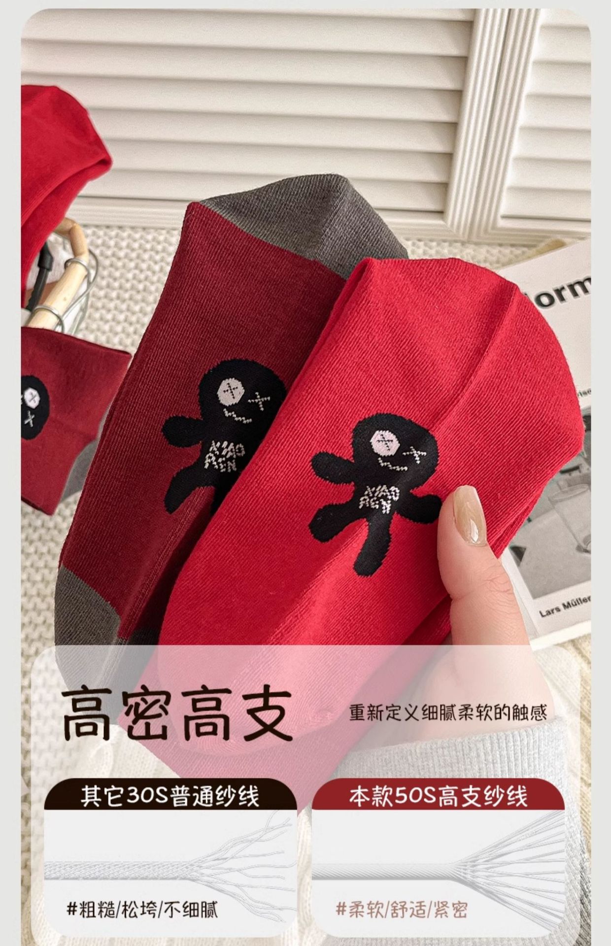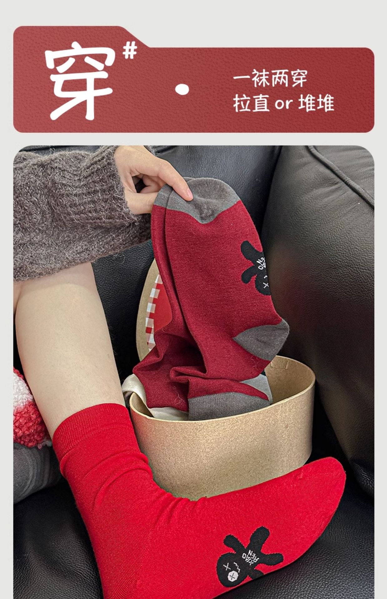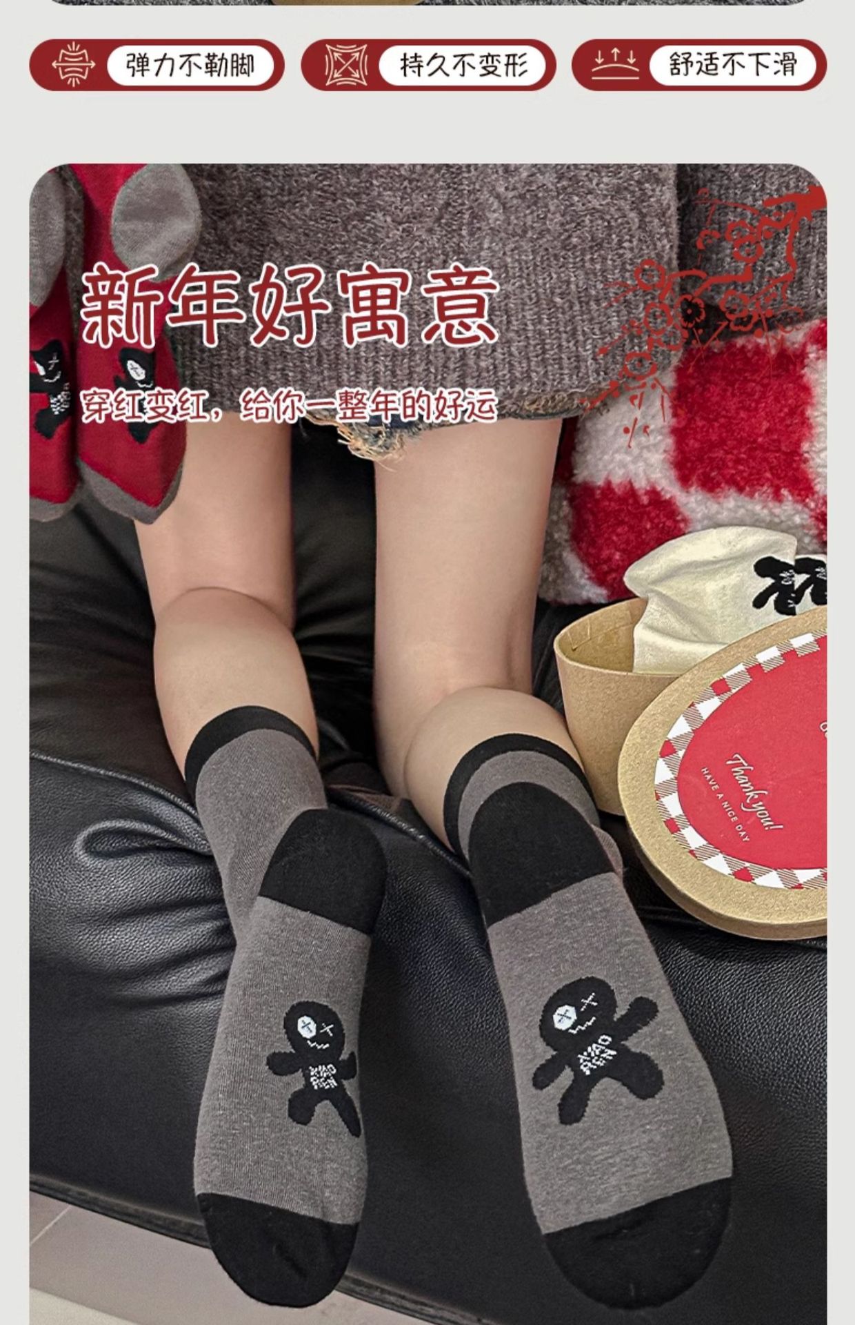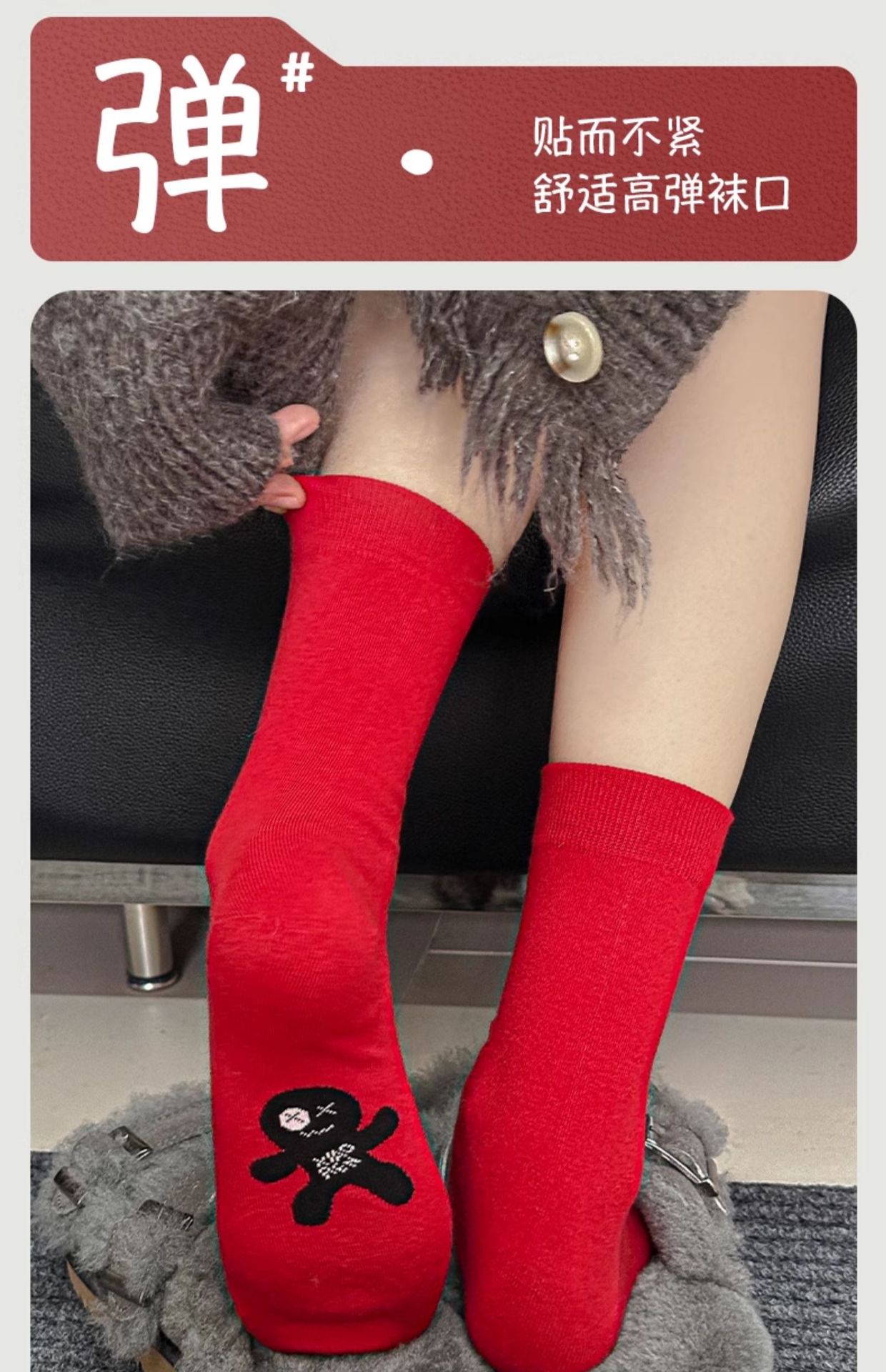 踩地袜红袜子女秋冬中筒袜卡通小人安可拉红2026马年本命年无骨袜